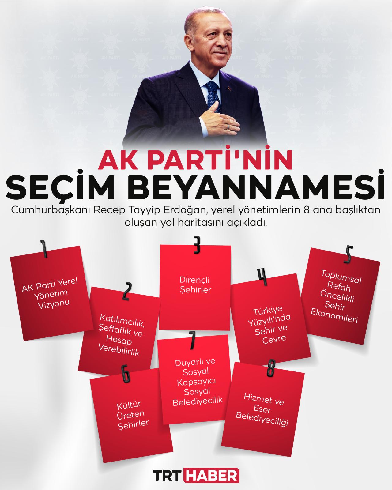 31 Mart 2024 yerel seçimlerine yönelik hazırlanan AK Parti'nin seçim beyannamesi 8 ana başlıktan oluşuyor. Beyannamenin sloganı "Türkiye Yüzyılı Şehirleri için Gerçek Belediyecilik" oldu.
