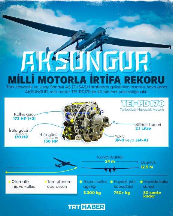 Türk Havacılık ve Uzay Sanayii AŞ (TUSAŞ) tarafından geliştirilen insansız hava aracı AKSUNGUR'un milli motor TEI-PD170 ile 40 bin feet yüksekliğe çıkmasıyla TEI-PD170 irtifa rekoru kırdı.