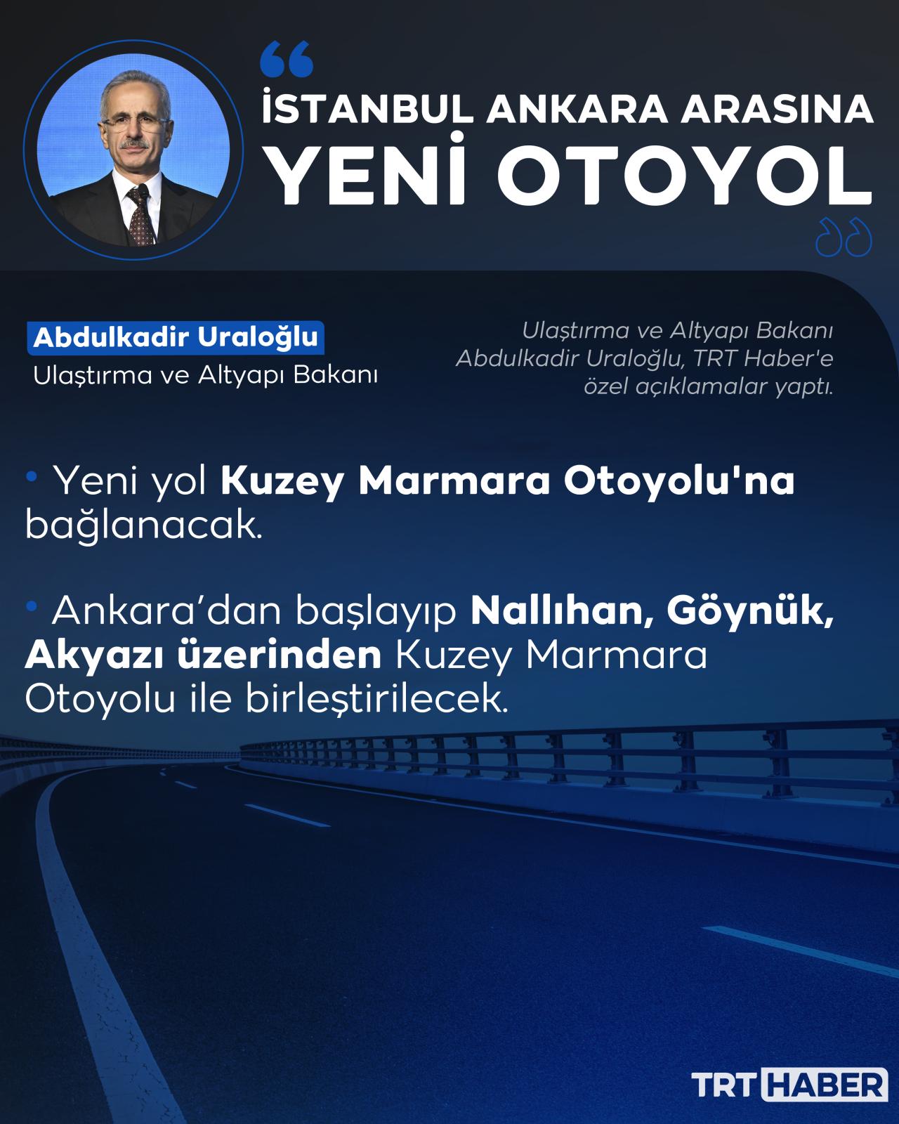 Ulaştırma ve Altyapı Bakanı Abdulkadir Uraloğlu, "Ankara-İstanbul arasında yeni bir otoyol projesi çalışıyoruz. Ankara'dan başlayıp Nallıhan-Göynük-Akyazı üzerinden Kuzey Marmara Otoyolu ile buluşmuş olacak" dedi.