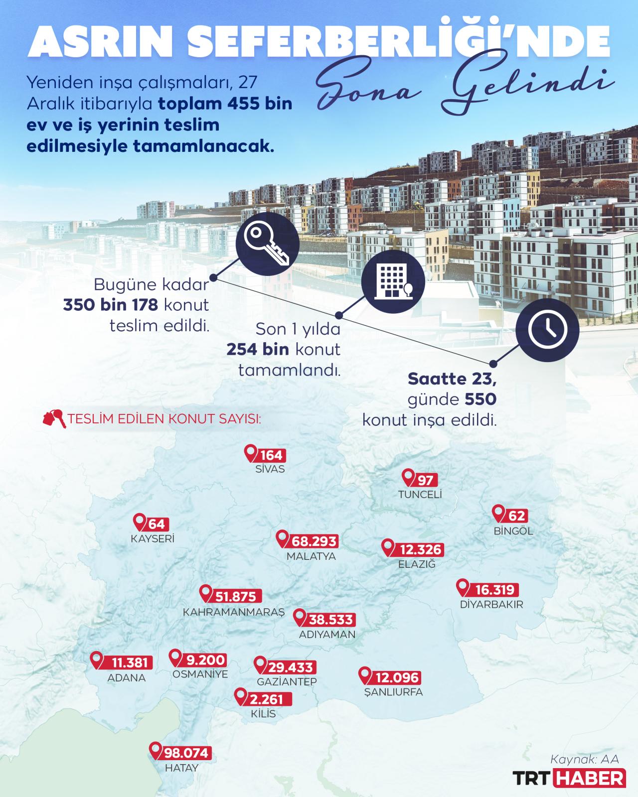 Cumhuriyet tarihinin en büyük felaketlerinden biri olan 6 Şubat 2023'teki Kahramanmaraş merkezli depremlerin ardından yeniden inşa sürecinde yıl sonunda toplam 455 bin ev ve iş yeri hak sahiplerine teslim edilecek ve böylece deprem bölgesindeki inşa çalışmaları tamamlanmış olacak.