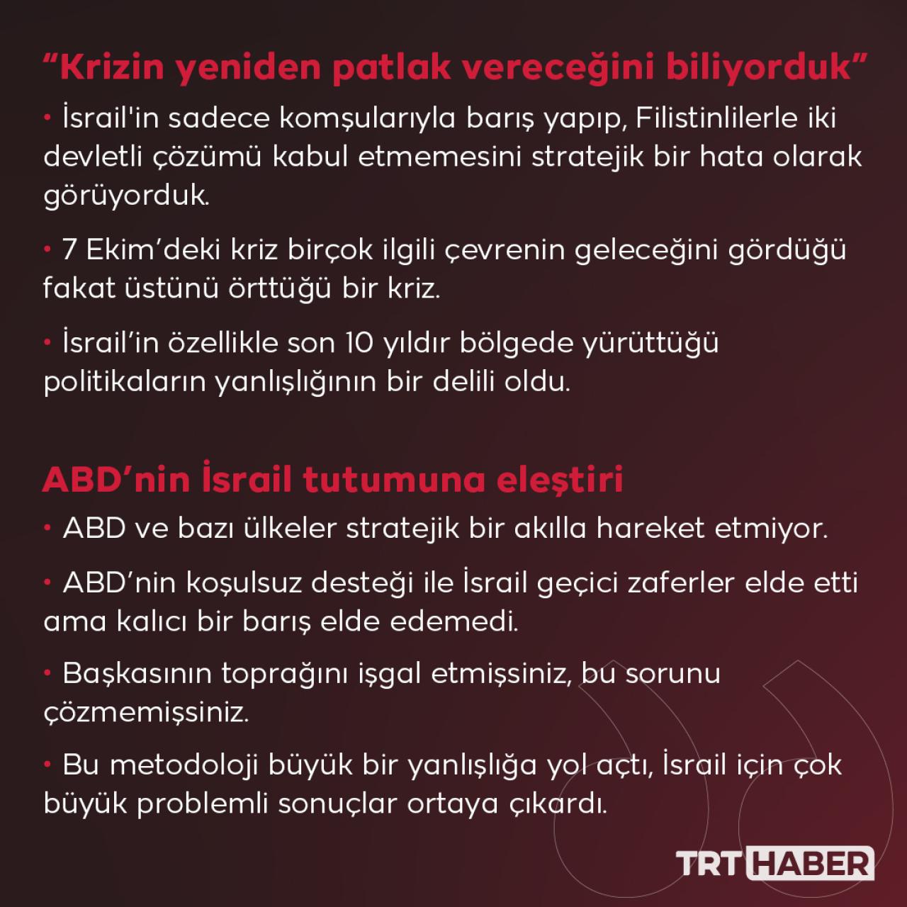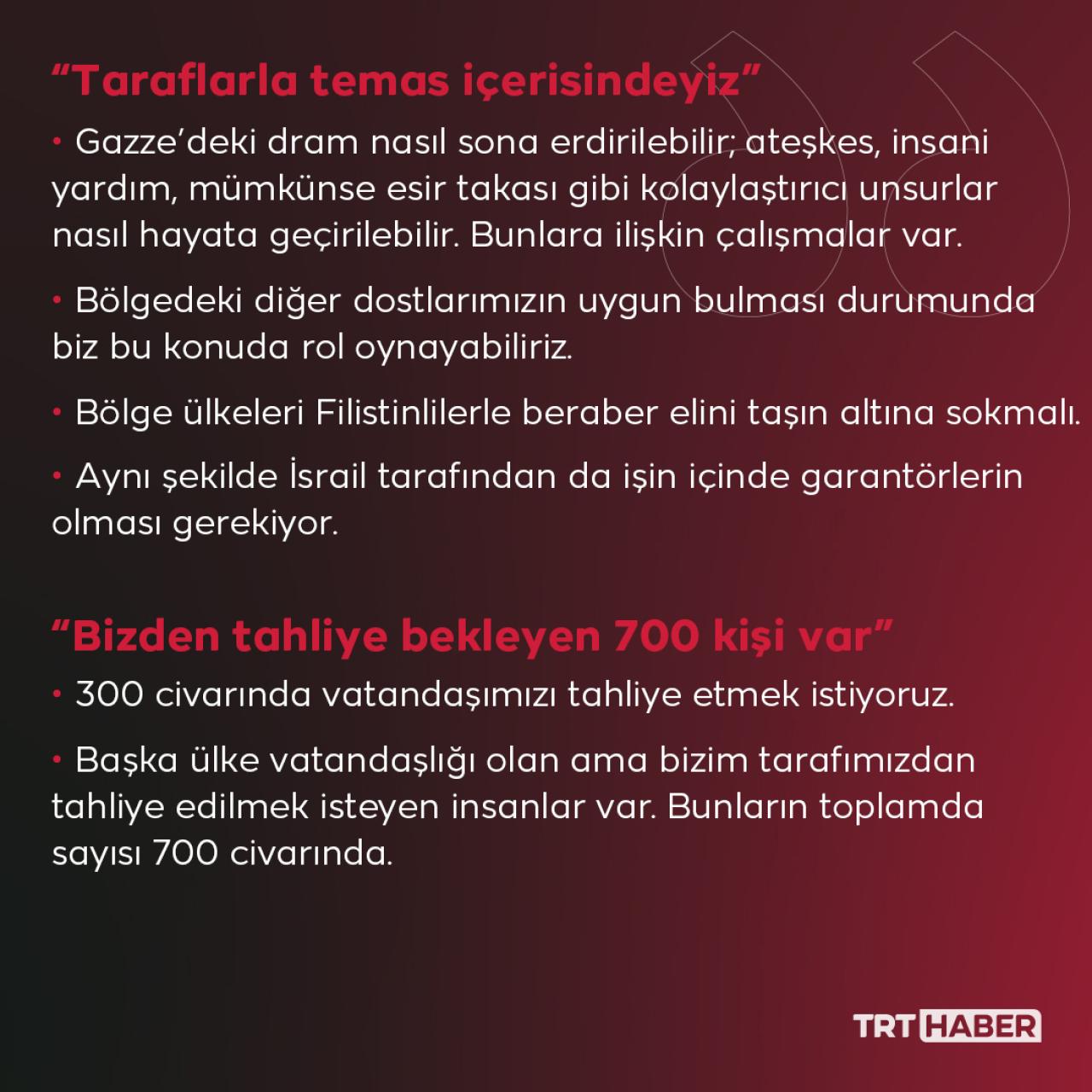 Dışişleri Bakanı Hakan Fidan, "Garantörlük konusu aslında bölge ülkelerinin meseleyi aktif olarak sahiplenme meselesi. Bir şekilde bölge ülkeleri Filistinlilerle beraber elini taşın altına sokacaklar. Bölgedeki diğer dostlarımızın bunu uygun bulması durumunda biz bu konuda rol oynayabiliriz" dedi.