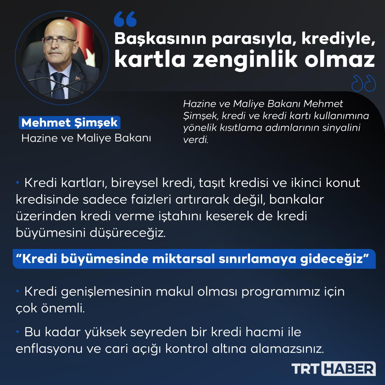 Hazine ve Maliye Bakanı Mehmet Şimşek, "Kredi kartları, bireysel kredi, taşıt kredisi ve ikinci konut kredisinde sadece faizleri artırarak değil, bankalar üzerinden kredi verme iştahını keserek de kredi büyümesini düşüreceğiz" dedi.