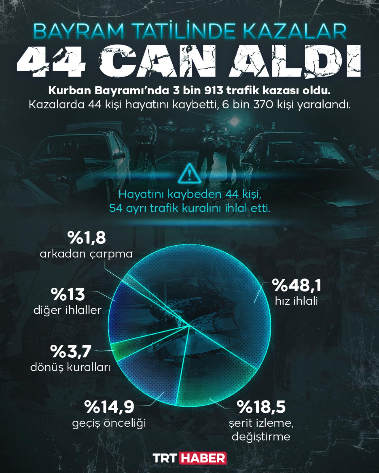 Kurban Bayramı’nda 3 bin 913 trafik kazası oldu. Kazalarda 44 kişi hayatını kaybetti, 6 bin 370 kişi yaralandı.