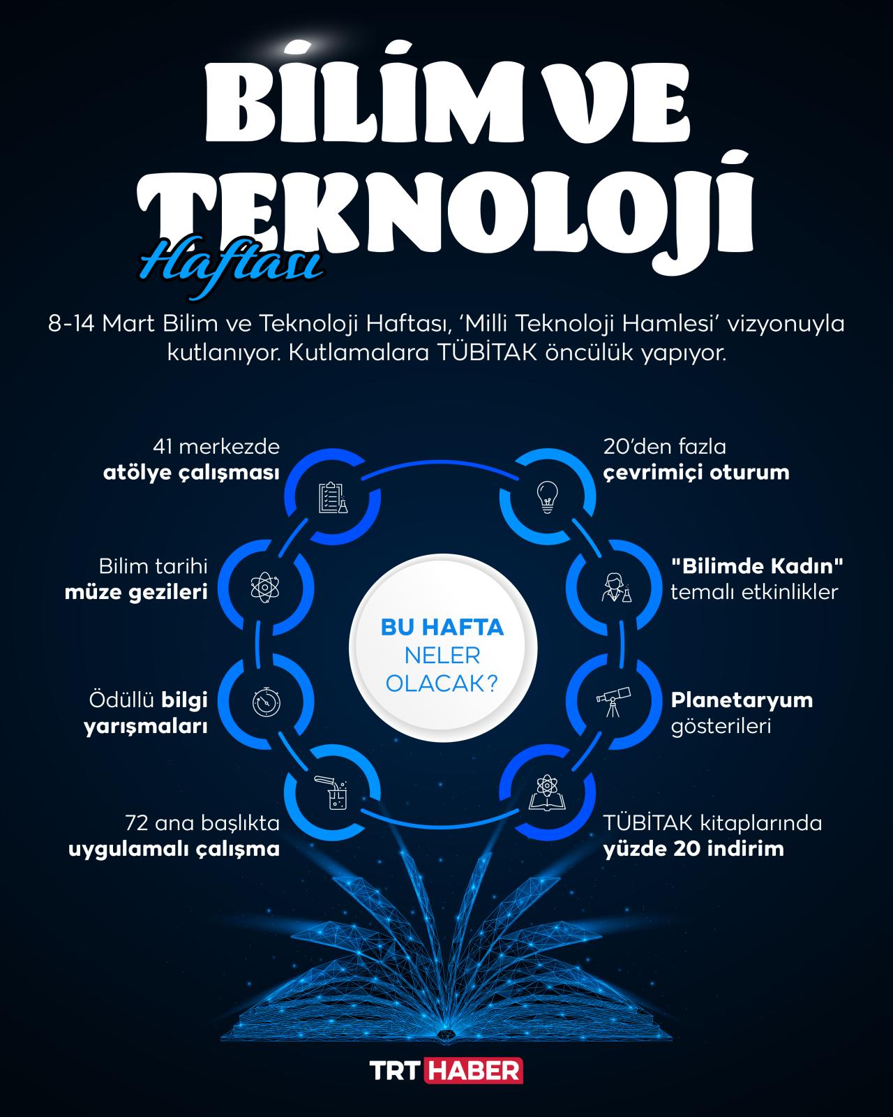 Bilim ve Teknoloji Haftası bu yıl ‘Milli Teknoloji Hamlesi’ vizyonu doğrultusunda kutlanıyor. 81 ilde etkinlikler düzenlenecek, 41 TÜBİTAK bilim merkezi tarafından 72 farklı ana başlıkta atölye serisi düzenlenecek. 8 Mart dolayısıyla ‘Bilimde Kadın’ temalı etkinlikler de yapılacak.