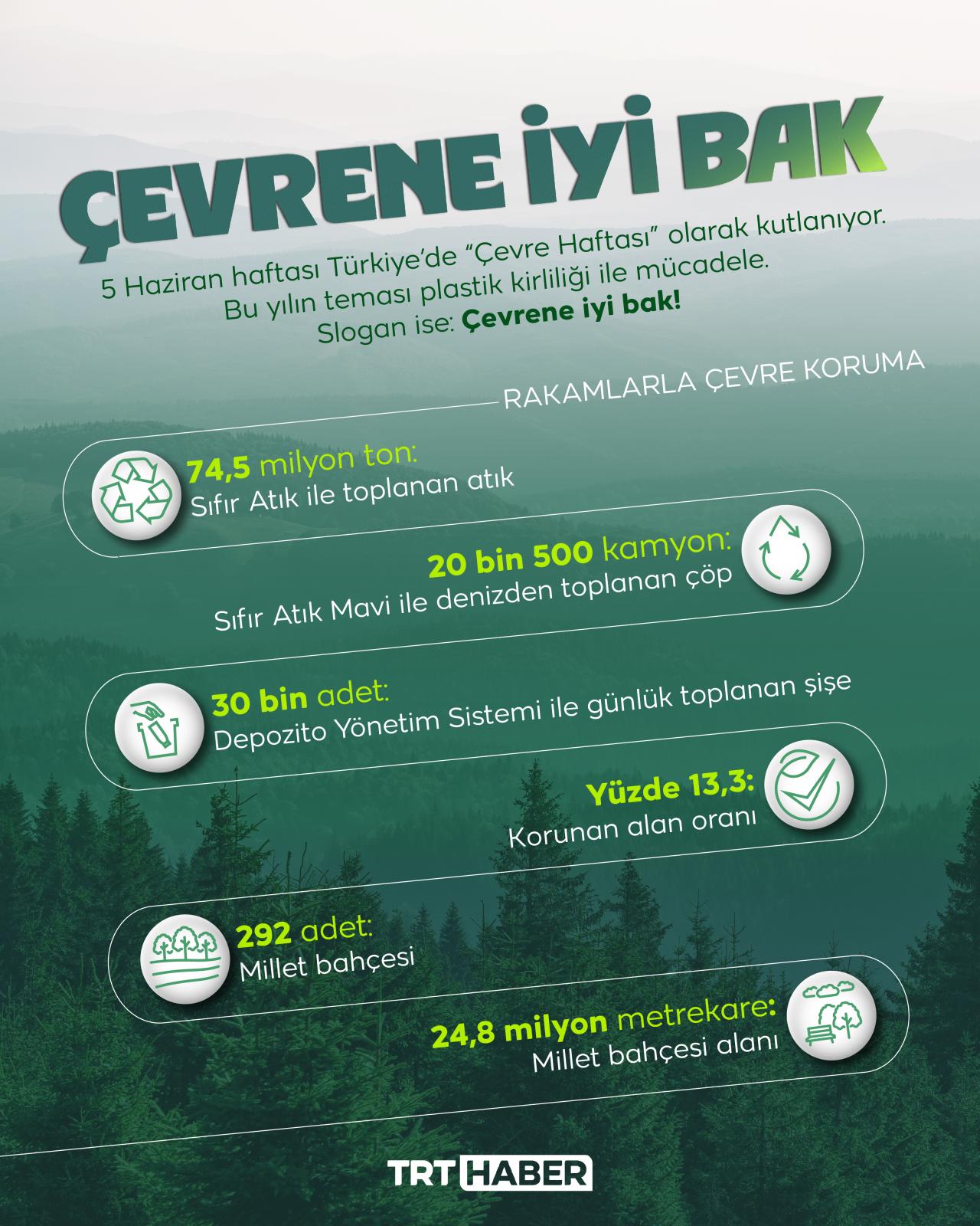 Bu yıl Çevre Günü ve Haftası “Çevrene İyi Bak!” sloganı ile kutlanıyor. Türkiye çevre konusunda son yıllarda çok önemli gelişmelere imza attı. Sıfır Atık ile 74,5 milyon atık toplandı, denizler temizlendi, millet bahçeleri artırıldı, Depozito Yönetim Sistemi devreye girdi.