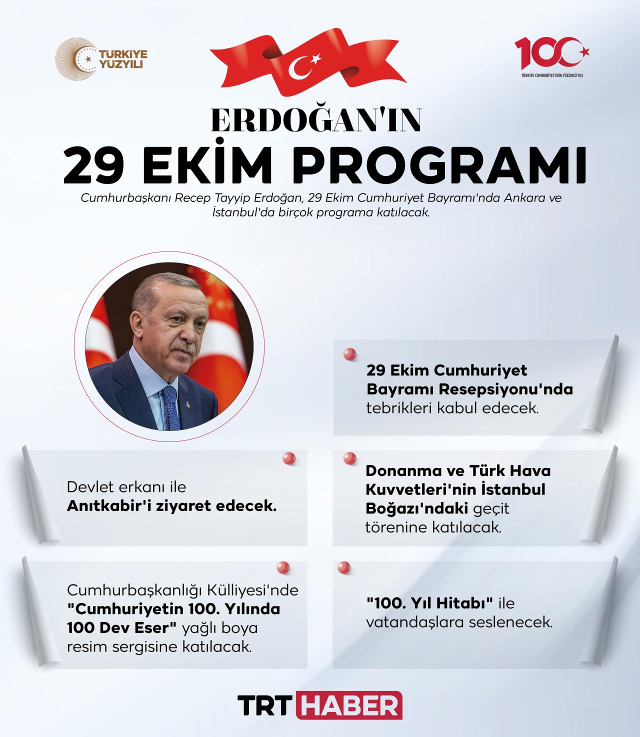 Cumhurbaşkanı Recep Tayyip Erdoğan, 29 Ekim Cumhuriyet Bayramı'nda Ankara ve İstanbul'da düzenlenecek özel programlara katılacak.