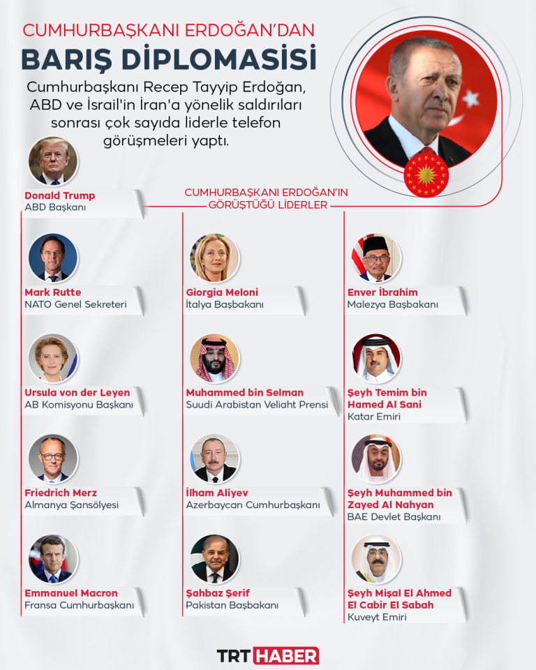 ABD ve İsrail’in İran’a yönelik saldırıları sonrası Cumhurbaşkanı Erdoğan, bölgedeki çatışmaların sonlandırılması için çok sayıda liderle telefon görüşmesi gerçekleştirdi.