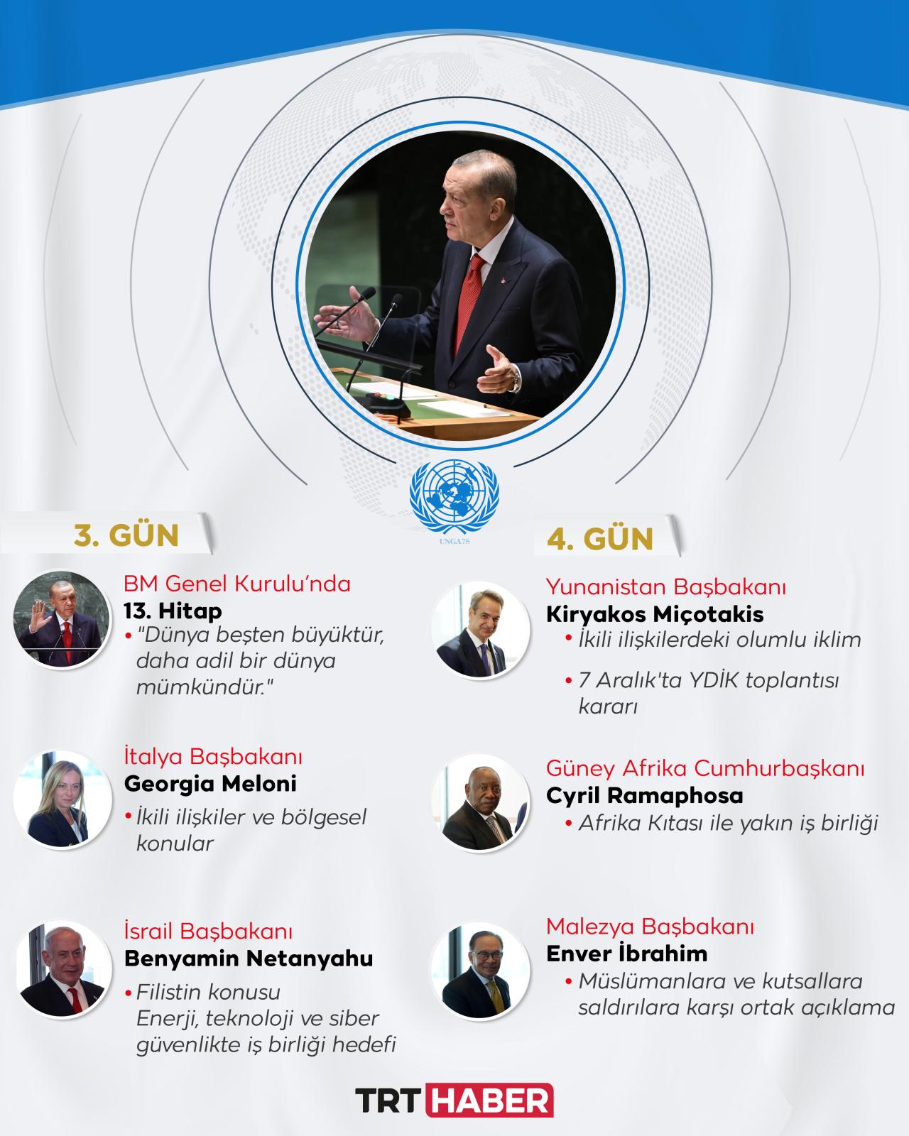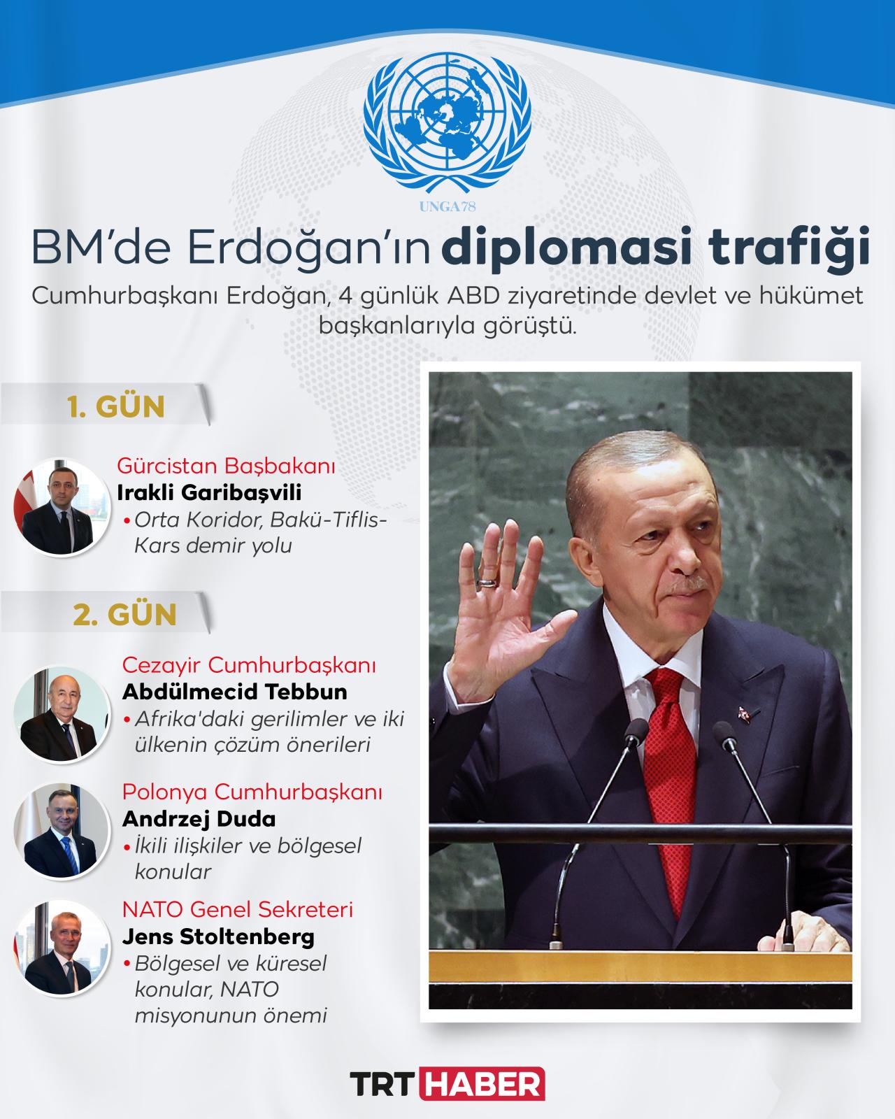 Cumhurbaşkanı Recep Tayyip Erdoğan, Birleşmiş Milletler (BM) 78. Genel Kurulu için bulunduğu New York'ta, çok sayıda devlet ve hükümet başkanıyla görüştü. Görüşmelerde, işbirliği çalışmaları ve bölgesel meseleler değerlendirildi.