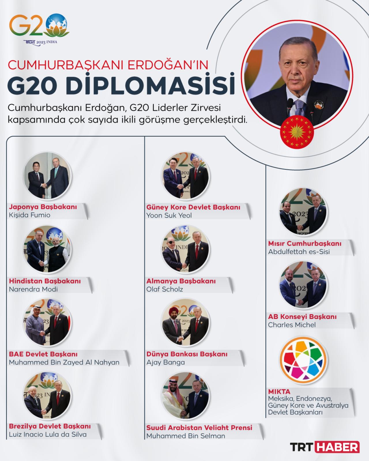 Cumhurbaşkanı Recep Tayyip Erdoğan, Hindistan'ın ev sahipliğindeki 2023 G20 Liderler Zirvesi kapsamında, ülkeyi ve bölgesel gelişmeleri önceleyen diplomasi trafiği yürüttü.
