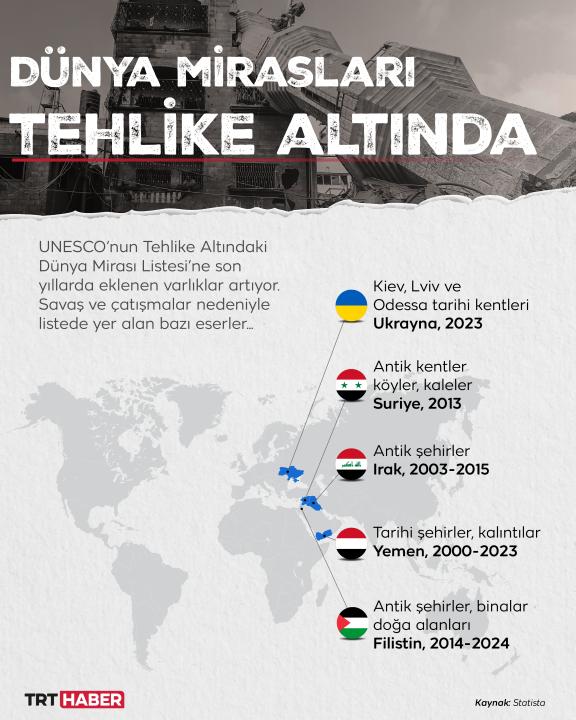 Silahlı çatışmalar, doğal afetler ve kontrolsüz kentleşme, Dünya Mirası alanlarını tehdit ediyor. UNESCO'nun Tehlike Altındaki Dünya Mirası Listesi, uluslararası toplumu bu tehditler karşısında harekete geçmeye çağırıyor. Filistin ve Ukrayna, bu listede öne çıkan ülkeler arasında yer alıyor.