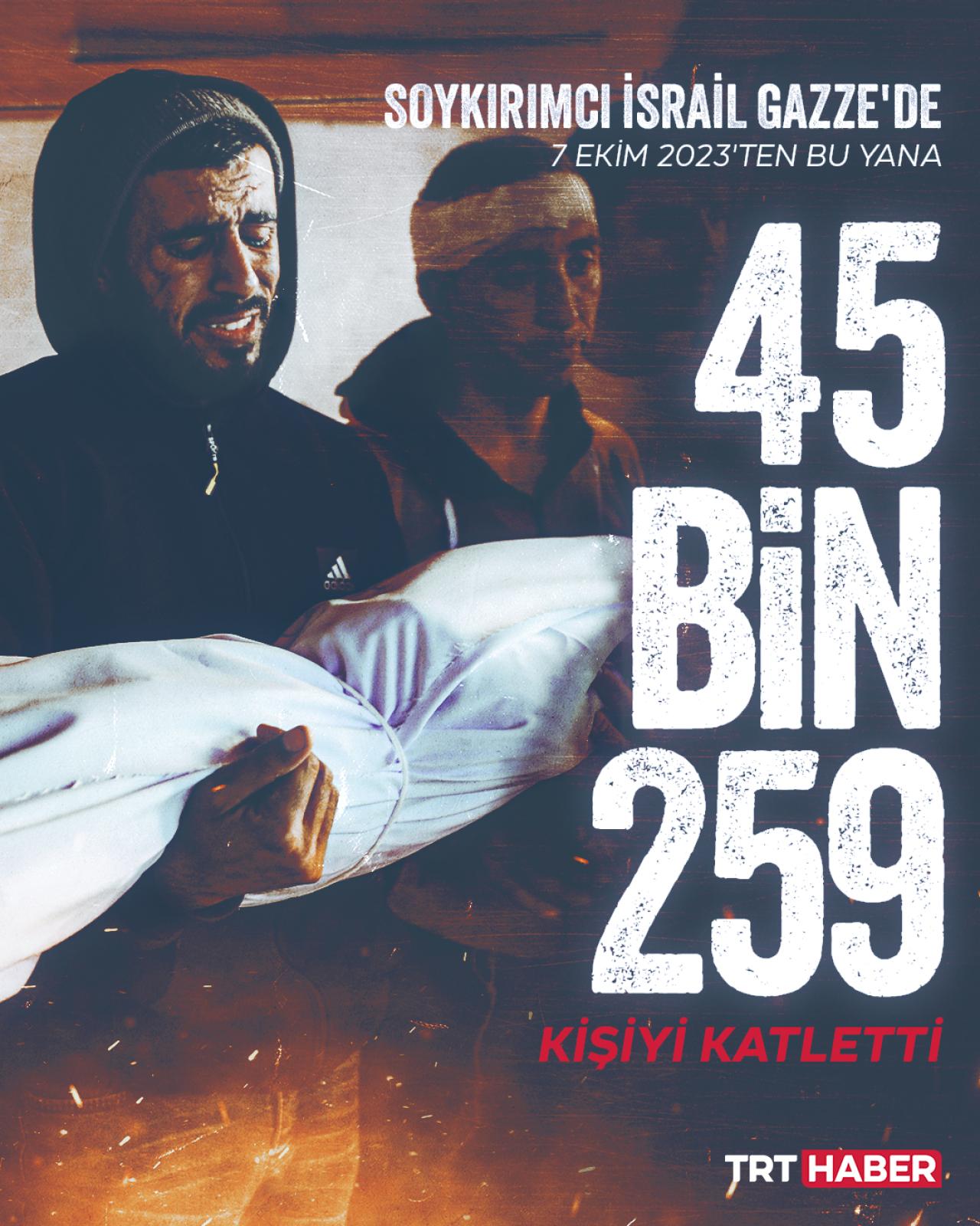 Soykırımcı İsrail ordusunun Gazze Şeridi'ne 7 Ekim 2023'ten bu yana düzenlediği saldırılarda hayatını kaybedenlerin sayısı son 24 saatte 32 artarak, 45 bin 259'a yükseldi.