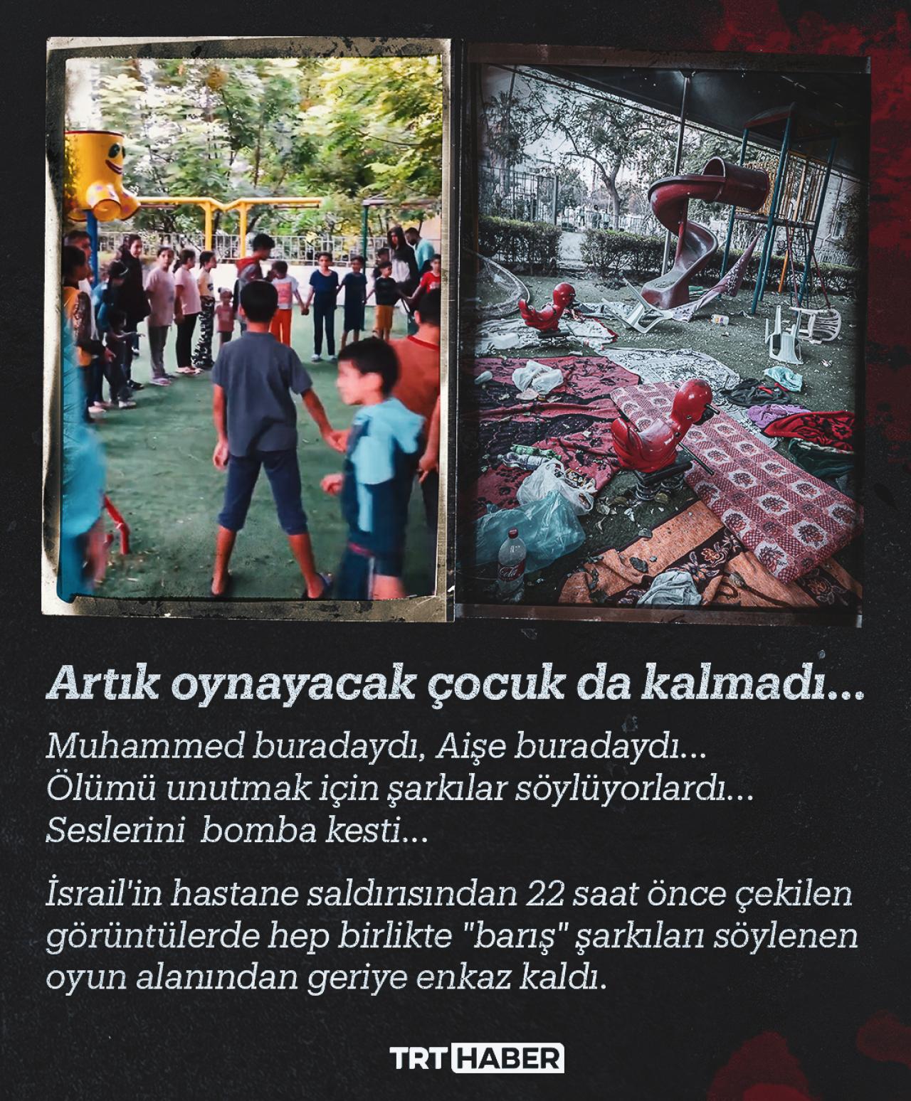 Muhammed buradaydı, Aişe buradaydı... Ölümü unutmak için ‘barış’ şarkıları söylüyorlardı... İsrail’in hedef aldığı hastanede saldırıdan 22 saat önce çekilen görüntülerden geriye virane bir bahçe kaldı. Çocukların akıbeti ise bilinmiyor…