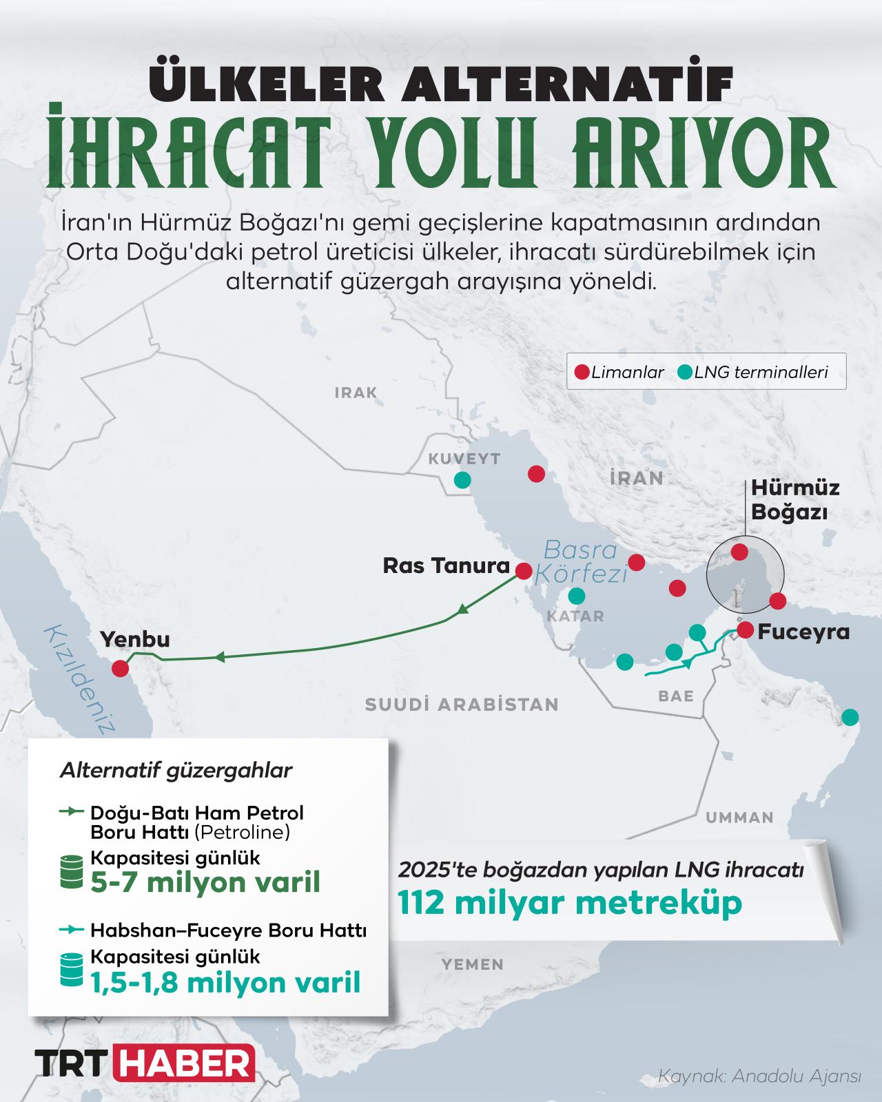 İran'ın Hürmüz Boğazı'nı gemi geçişlerine kapatmasının ardından Orta Doğu'daki petrol üreticisi ülkeler, petrol ihracatını sürdürebilmek için alternatif güzergah arayışına yöneldi.