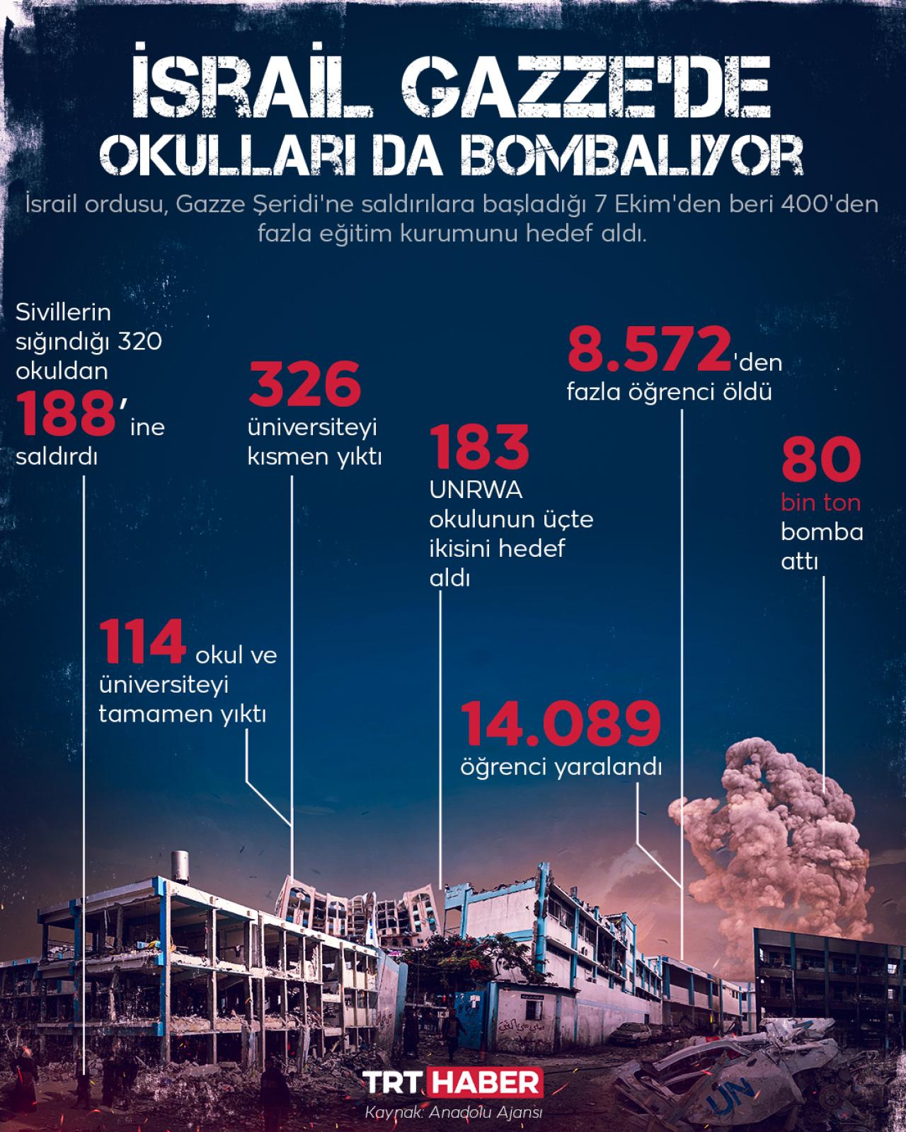 İsrail ordusu, Gazze Şeridi'ne yönelik saldırılarına başladığı 7 Ekim'den beri 400'den fazla okul, üniversite ve bağlı binayı hedef aldı.