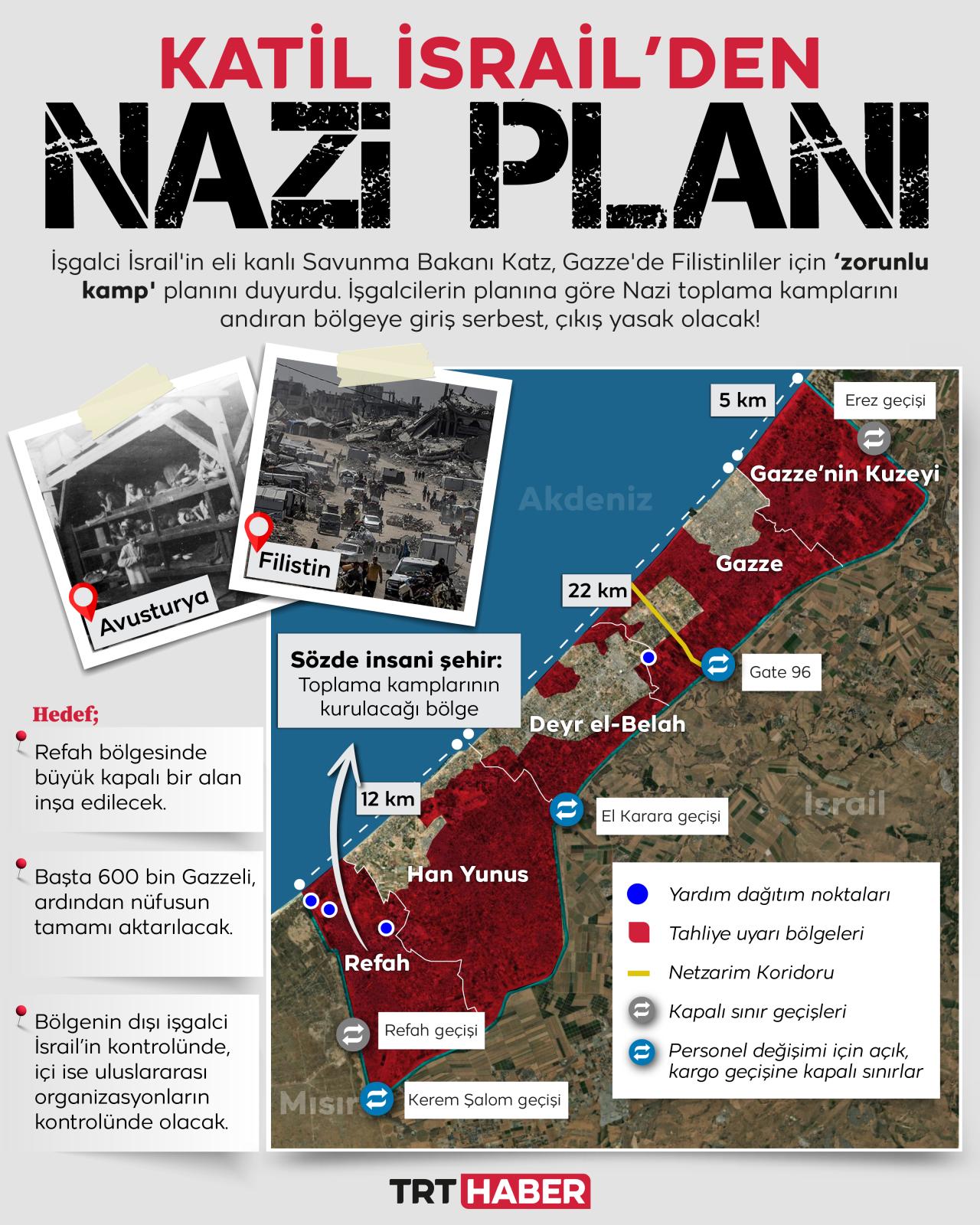 İşgalci İsrail'in sözde “İnsani şehir” adı altında sunduğu Nazi toplama kampı planı, Gazze’nin yıkıntıları üzerine inşa edilmek istenen kontrollü bir sürgün alanı. Katılım gönüllü değil, çıkış ise yasak.
