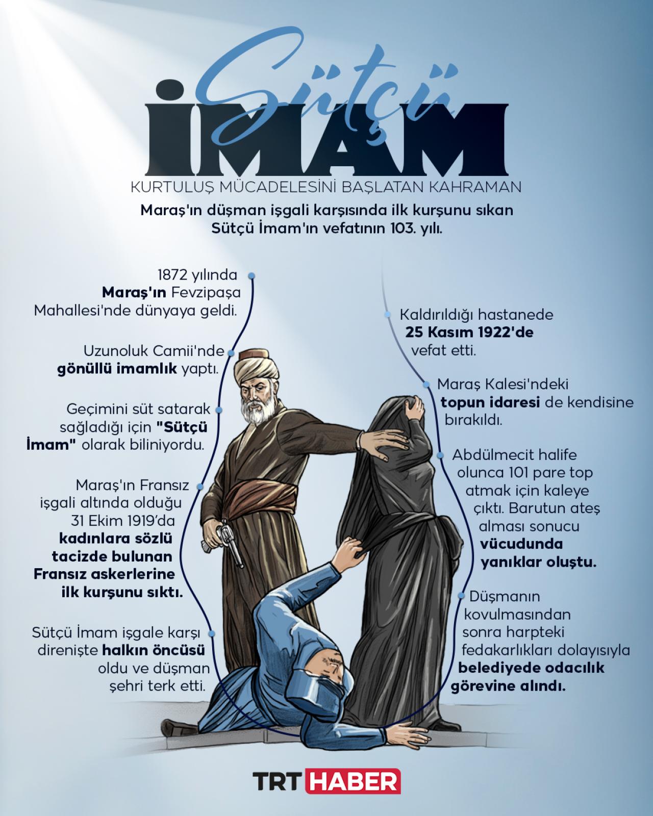 İşgalci kuvvetlere ilk kurşunu sıkarak Kahramanmaraş'taki kurtuluş mücadelesini başlattı. Milli Mücadele'nin fitilini ateşleyen kahraman Sütçü İmam'ın, vefatının 103. yılı.