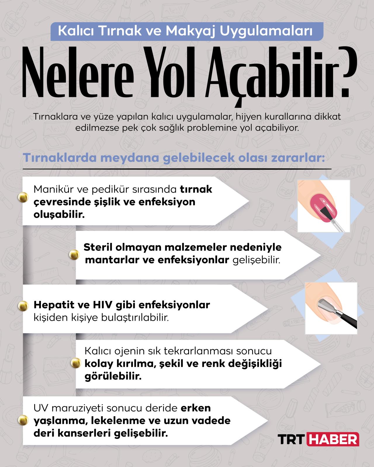 Her zaman güzel ve bakımlı görünmek isteyen pek çok kadın tercihini kalıcı tırnak ve makyaj uygulamalarından yana kullanıyor. Son yıllarda giderek yaygınlaşan bu uygulamaların yüze ve tırnaklara zarar vermemesi için işin uzmanları tarafından steril bir ortamda yapılması gerekiyor.