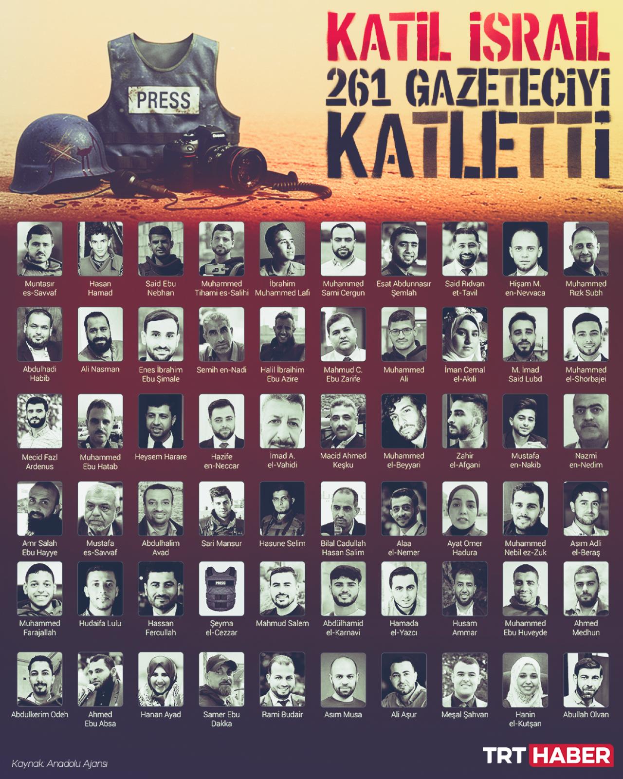 İsrail ordusunun, Gazze Şeridi'ne düzenlediği saldırılarda yaşamını yitiren gazeteci sayısı 261'e yükseldi.