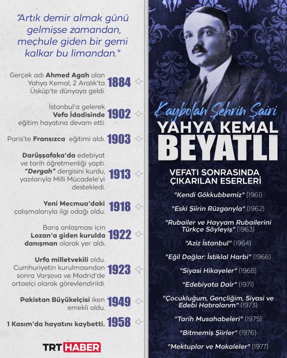 Türk edebiyatına unutulmaz eserler kazandıran "kaybolan şehrin şairi" Yahya Kemal Beyatlı, aramızdan ayrılalı 66 yıl oldu.