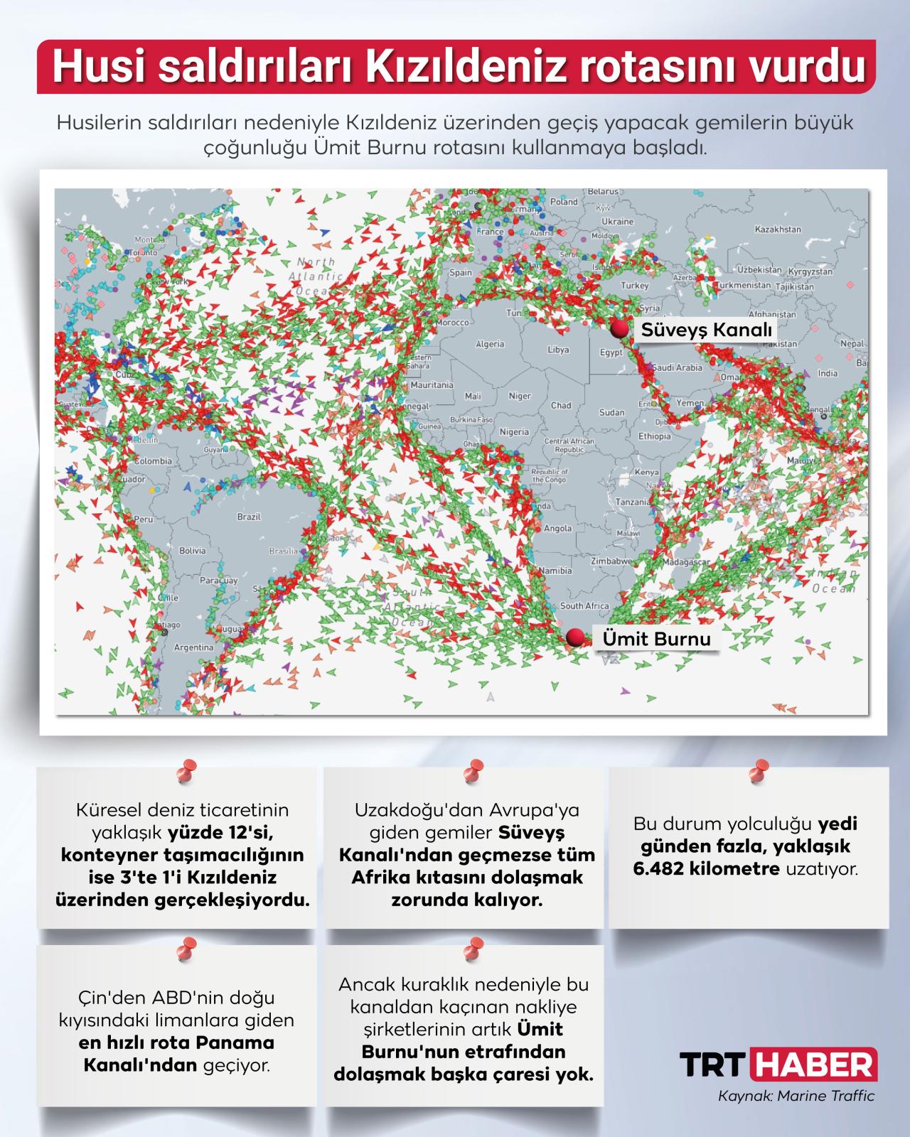 Yemen’deki Husilerin saldırıları sonucu uluslararası konteyner taşımacılık şirketleri rotayı Babu'l Mendeb Boğazı’ndan Ümit Burnu’na çevirdi. Bu rota değişikliği yolculuğu, 7 ila 10 gün uzatıyor. Küresel ticaretin yüzde 12’sinin gerçekleştiği Kızıldeniz’de yaşanan kriz, yakıttan tüketim mallarına geniş bir alanda fiyat artışlarına neden olabilir.