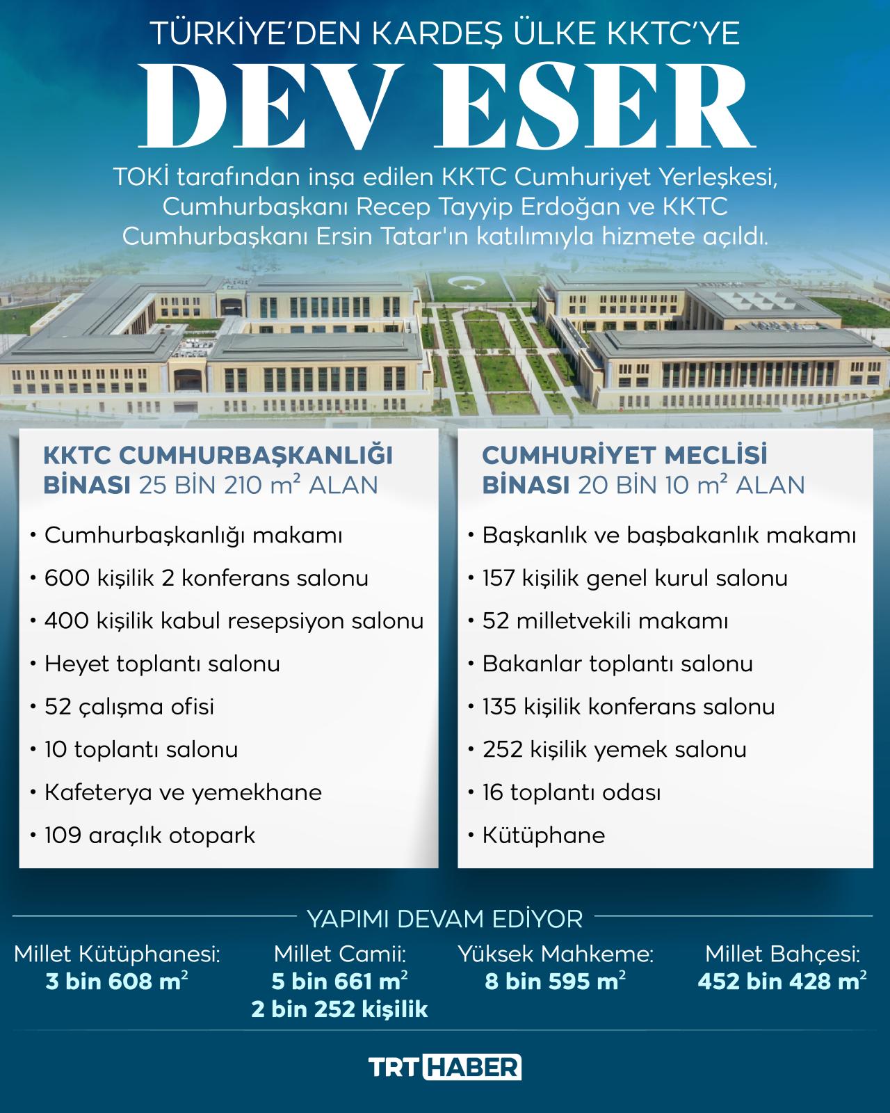 Cumhurbaşkanı Recep Tayyip Erdoğan, "Cumhuriyet yerleşkesi Kıbrıs Türk halkının kararlılığının sembolüdür. Burası aynı zamanda haksızlık ve hukuksuzluklar karşısında bir devletin var olma iradesinin tezahürüdür. Türkiye ve Kuzey Kıbrıs'ımızın kader ortaklığının da bir göstergesidir." dedi.