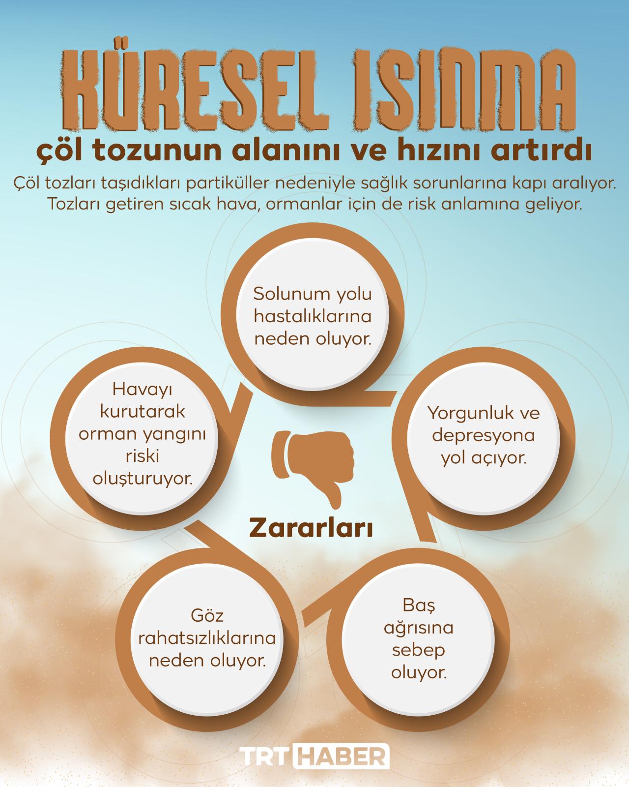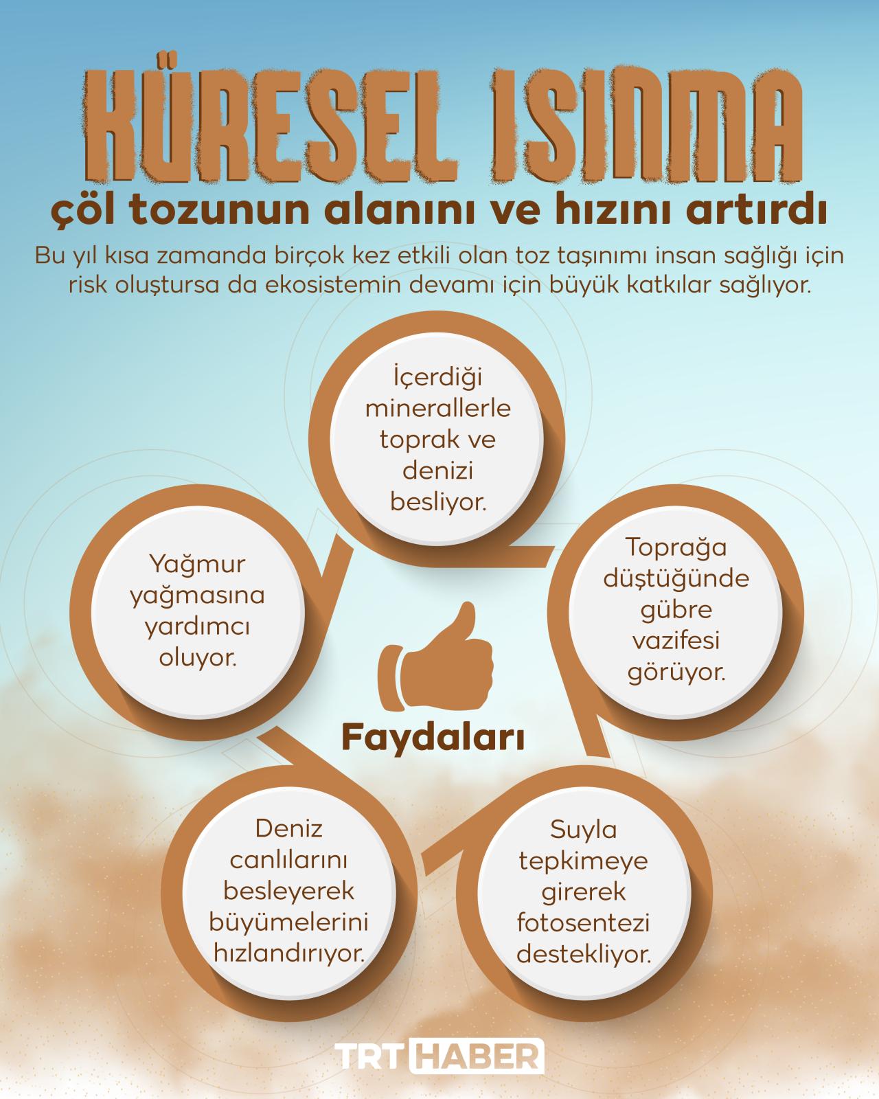 Her yıl belli zamanlarda Türkiye’de de etkisini gösteren çöl tozları, bu sene kısa aralıklarla birçok kez görüldü. Üstelik etki alanı genelde güney bölgeler olurken toz taşınımı kuzey batı bölgelere kadar da ulaştı. Bu durumun küresel ısınma kaynaklı olduğu, sıcaklıklar arttıkça sıklığının ve alanının da artacağı belirtiliyor.