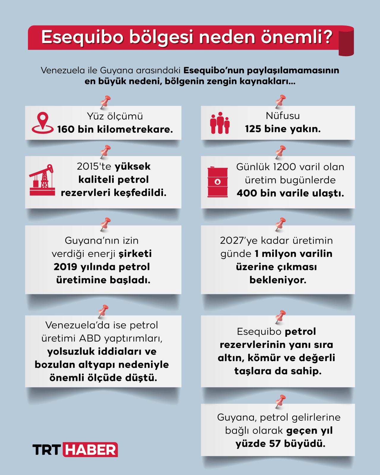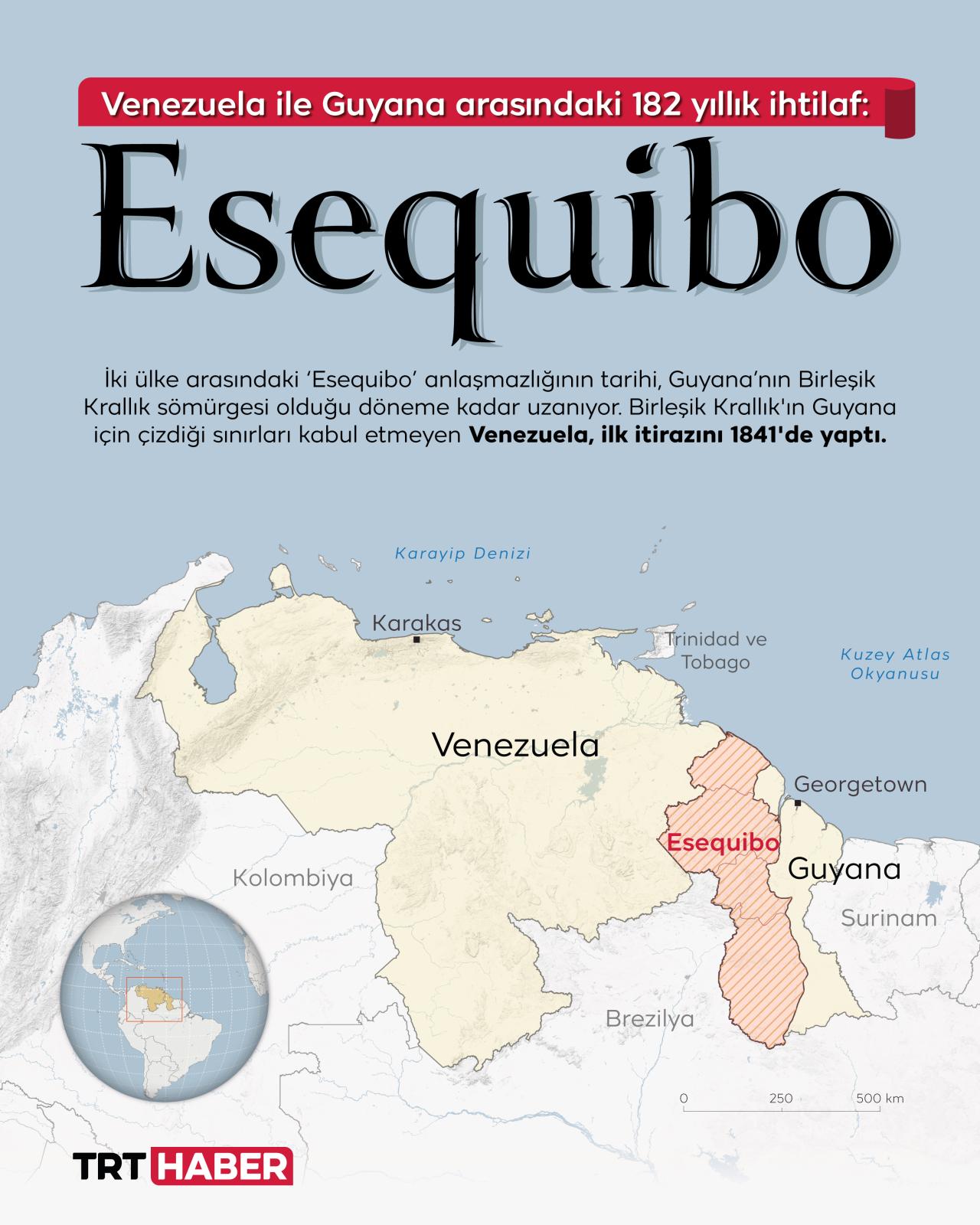 Venezuela ile komşusu Guyana’nın “Esequibo” bölgesi üzerinden yaşadığı toprak anlaşmazlığı 182 yıldır sürüyor. İki ülkenin arasındaki gerilim son haftalarda yeniden tırmandı. Venezuela bölgenin kendi toprağı olduğunu savunuyor, Guyana yönetimi ise bunu reddederek komşusunun bölgesel barışı tehdit ettiğini söylüyor.