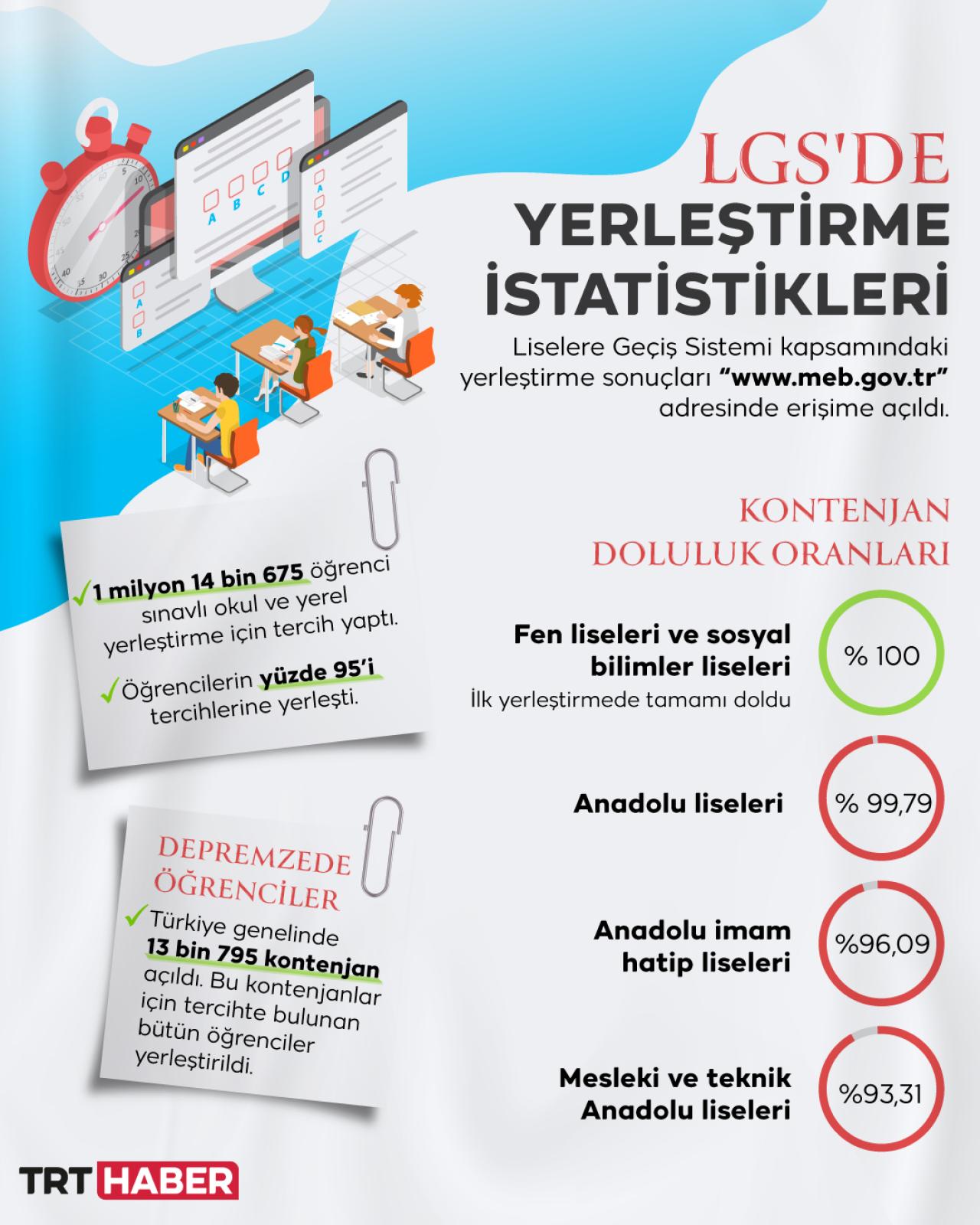 Milli Eğitim Bakanlığı, Liselere Geçiş Sistemi (LGS) kapsamındaki yerleştirme sonuçlarını, http://www.meb.gov.tr internet adresinden açıkladı. Sınavla öğrenci alan okullar ve yerel yerleştirme için tercih yapan 1 milyon 14 bin 675 öğrencinin yüzde 95’i tercihlerine yerleşti.