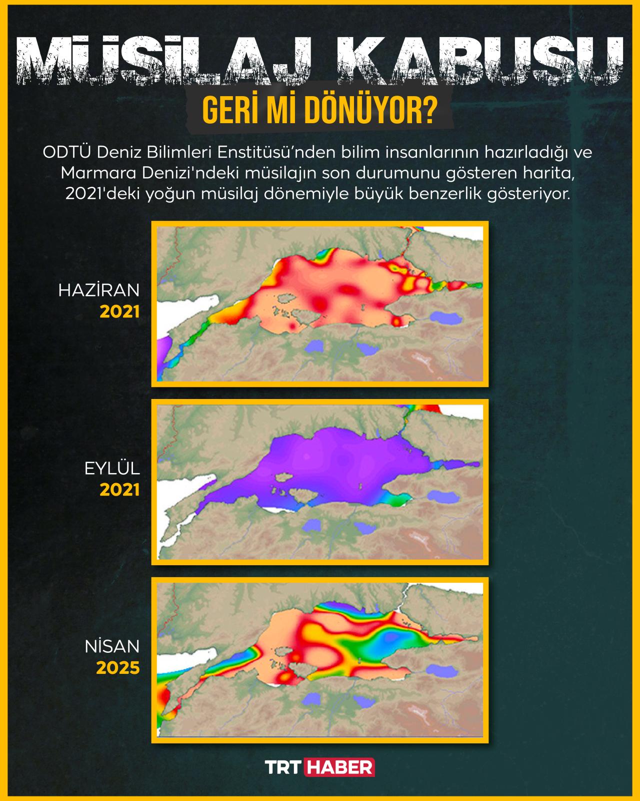 Orta Doğu Teknik Üniversitesi (ODTÜ) Deniz Bilimleri Enstitüsünden bilim insanlarının hazırladığı, Marmara Denizi'ndeki müsilajın son durumunu gösteren harita, 2021'deki yoğun müsilaj dönemiyle büyük benzerlik gösteriyor.