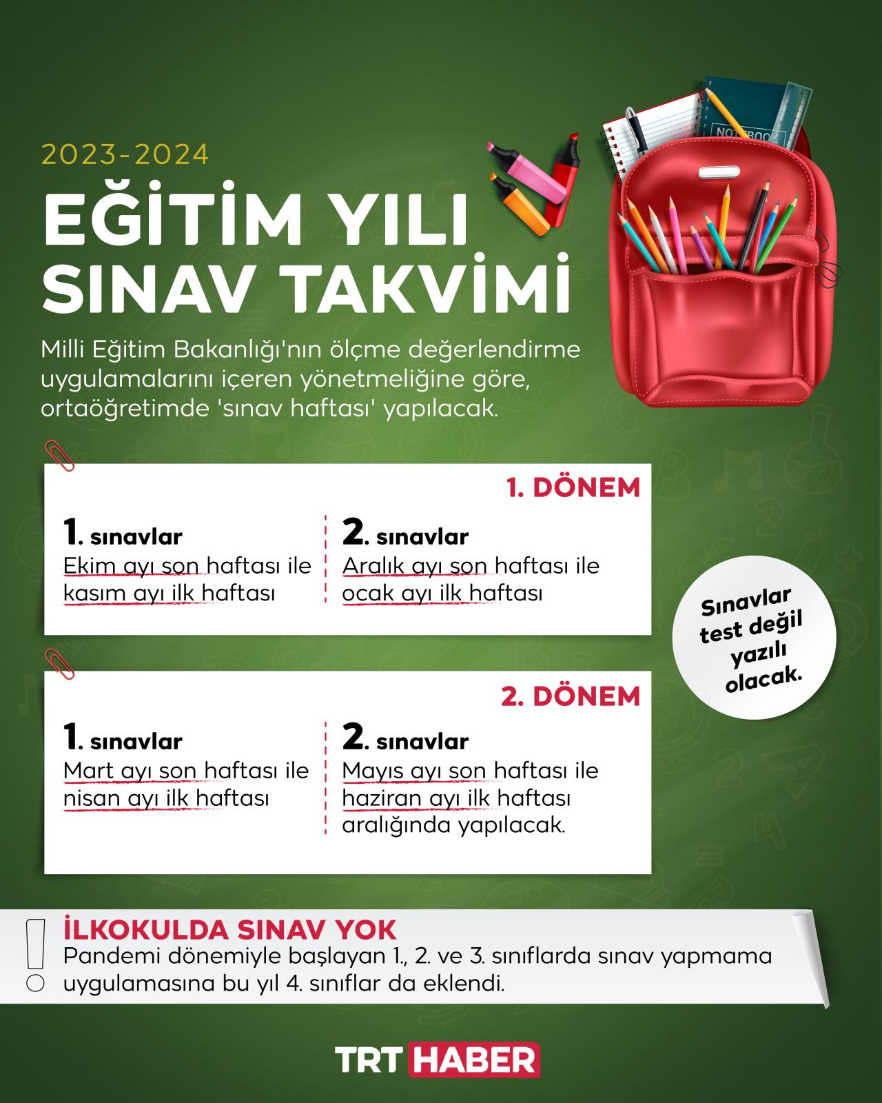 Milli Eğitim Bakanlığı Ölçme ve Değerlendirme Yönetmeliği'ne göre, ülke, il/ilçe ve okul genelinde ortak yazılı sınavlar yapılabilecek. Hangi sınıf ve derslerden ortak sınav yapılacağı, yıl başında Bakanlık tarafından duyurulacak.
