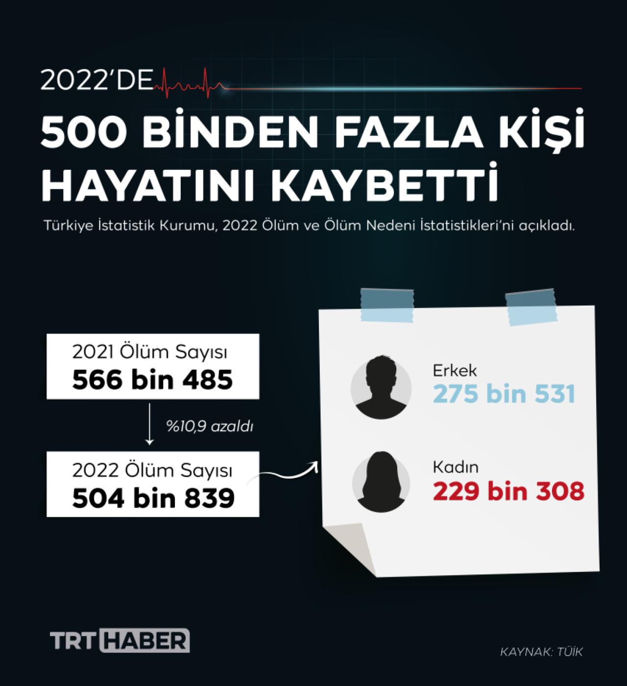 Türkiye'de 2022 yılında ölüm sayısı bir önceki yıla göre yüzde 10,9 azalarak 504 bin 839 olurken, söz konusu yılda yaşamını yitirenlerin yüzde 54,6'sını erkekler, yüzde 45,4'ünü kadınlar oluşturdu.