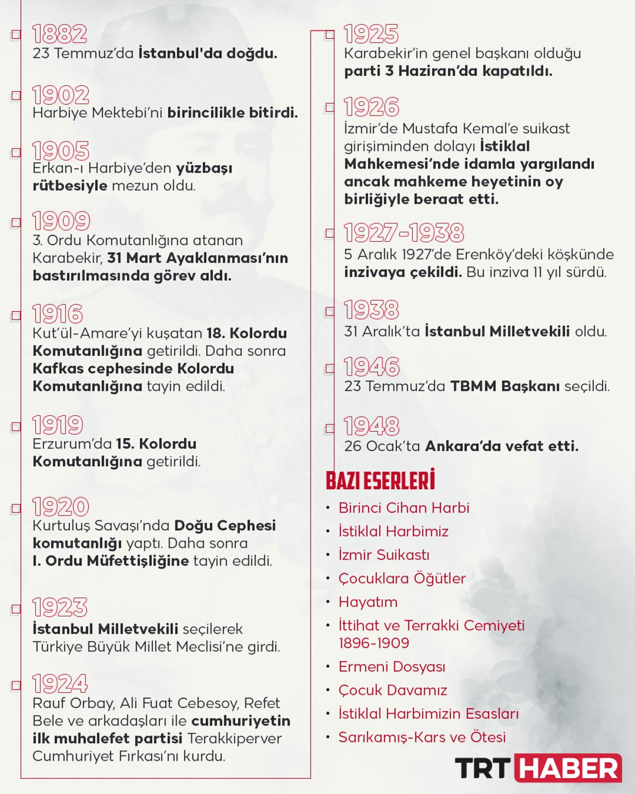 I. Dünya Savaşı ve Kurtuluş Savaşı yıllarında özellikle Doğu Anadolu’da gösterdiği kahramanlıklar dolayısıyla ‘Şark Fatihi’ ünvanı ile anılıyor.
