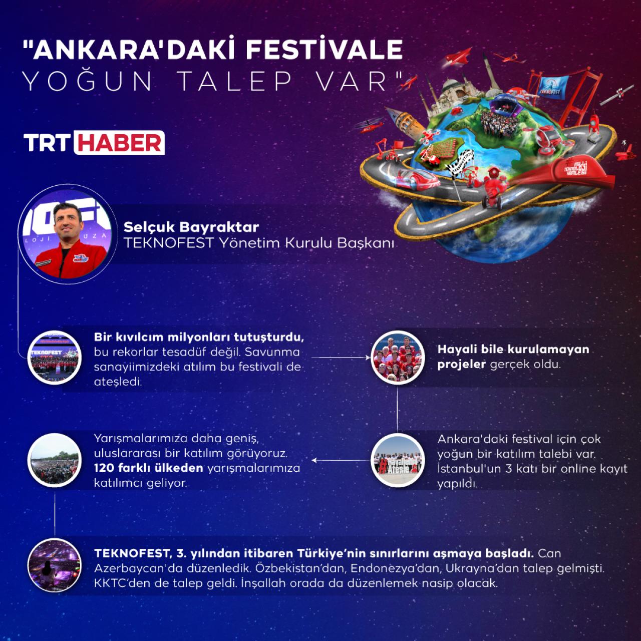 TRT Haber özel yayınına katılan TEKNOFEST Yönetim Kurulu Başkanı Selçuk Bayraktar değerlendirmelerde bulundu. Bayraktar, Ankara'daki festival için yoğun bir katılım olduğuna dikkat çekerek "İstanbul'un üç katı bir kayıt yapıldı, özellikle buraya gelirken milletimiz toplu taşımayı tercih ederlerse biraz daha rahat bir ulaşım olur" dedi.