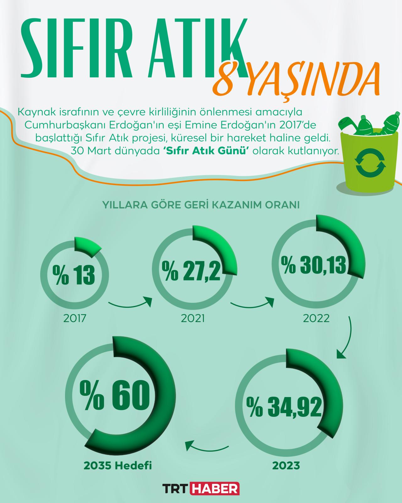 Türkiye’den çıkıp küresel bir politika haline gelen Sıfır Atık Projesi'nin 7 yılı geride kalırken çevrenin korunması ve kaynak israfının önlenmesi adına önemli işler başarılmasını sağladı. 193 bin bina ve yerleşke Sıfır Atık yönetimine geçti, 22 milyon kişi eğitildi, geri kazanım oranı 2023 sonunda yüzde 34’ü aştı. 2035’te hedef yüzde 60.