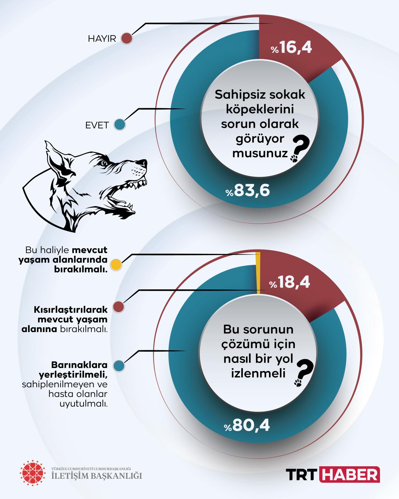 İletişim Başkanlığı, "Halkın Nabzı" araştırmaları kapsamında son yıllarda gündemden düşmeyen sokak köpekleri meselesini inceledi. Araştırmanın sonucunda mahallelerin yüzde 88,4'ünde sahipsiz sokak köpeklerinin bulunduğu ve katılımcıların yüzde 83,6'sının bunu "sorun" olarak gördüğü belirlendi.
