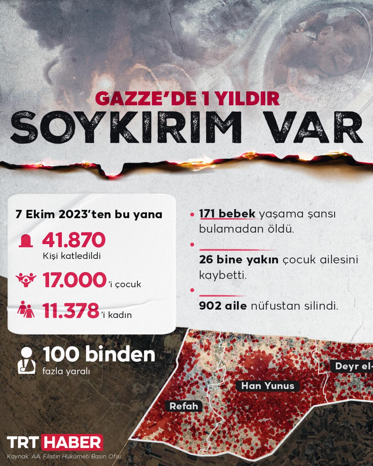 İsrail, bir yıl boyunca aralıksız şekilde bombaladığı Gazze Şeridi'nde kadın, çocuk, yaşlı, erkek ayırt etmeksizin on binlerce Filistinliyi katlederken, hayatta kalmayı başaranların yaşayabilecekleri alanları da yerle bir etti.
