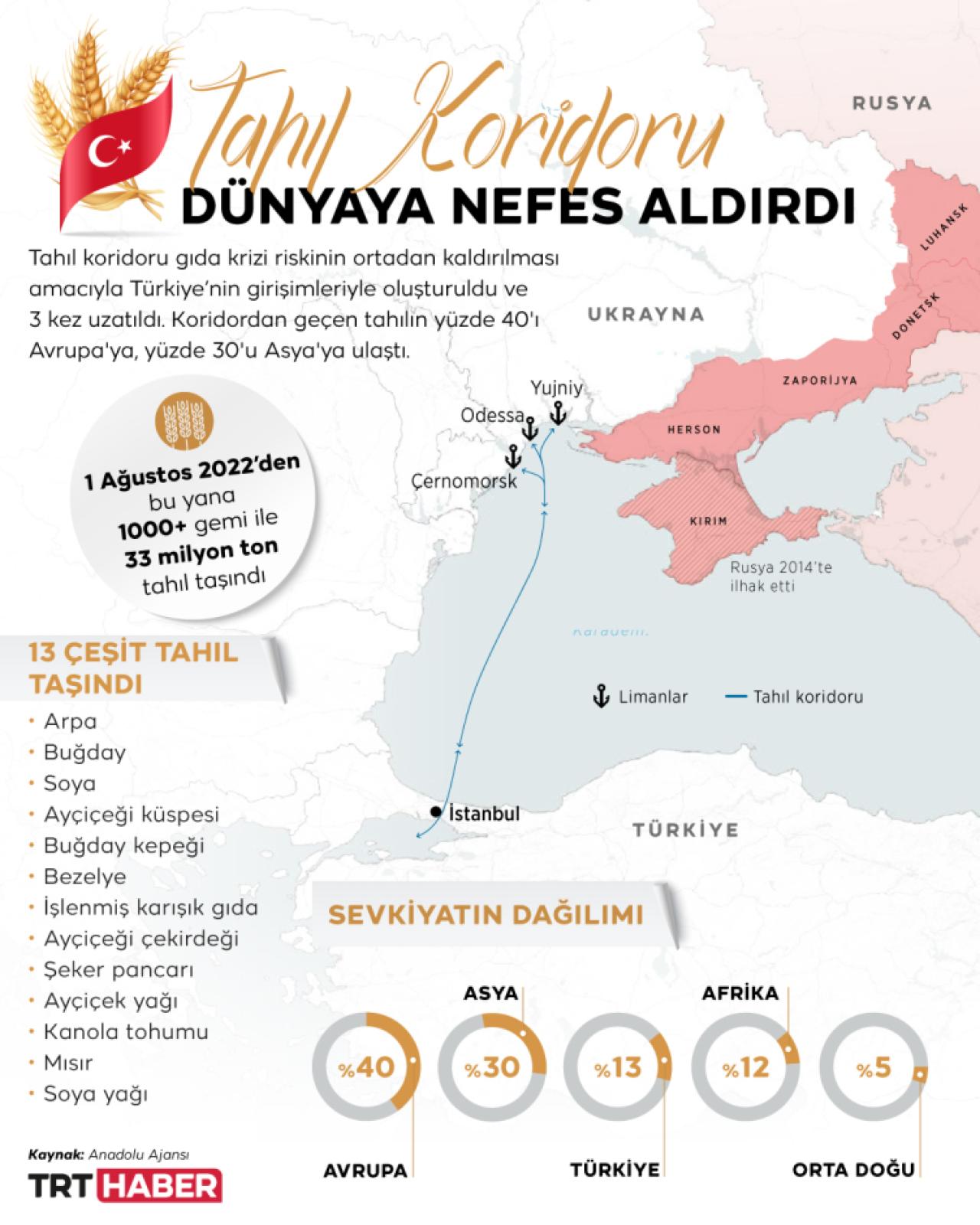Rusya-Ukrayna savaşı nedeniyle gıda krizi riskinin ortadan kaldırılması amacıyla oluşturulan tahıl koridorundan bugüne kadar 33 milyon tona yakın tahıl taşındı.