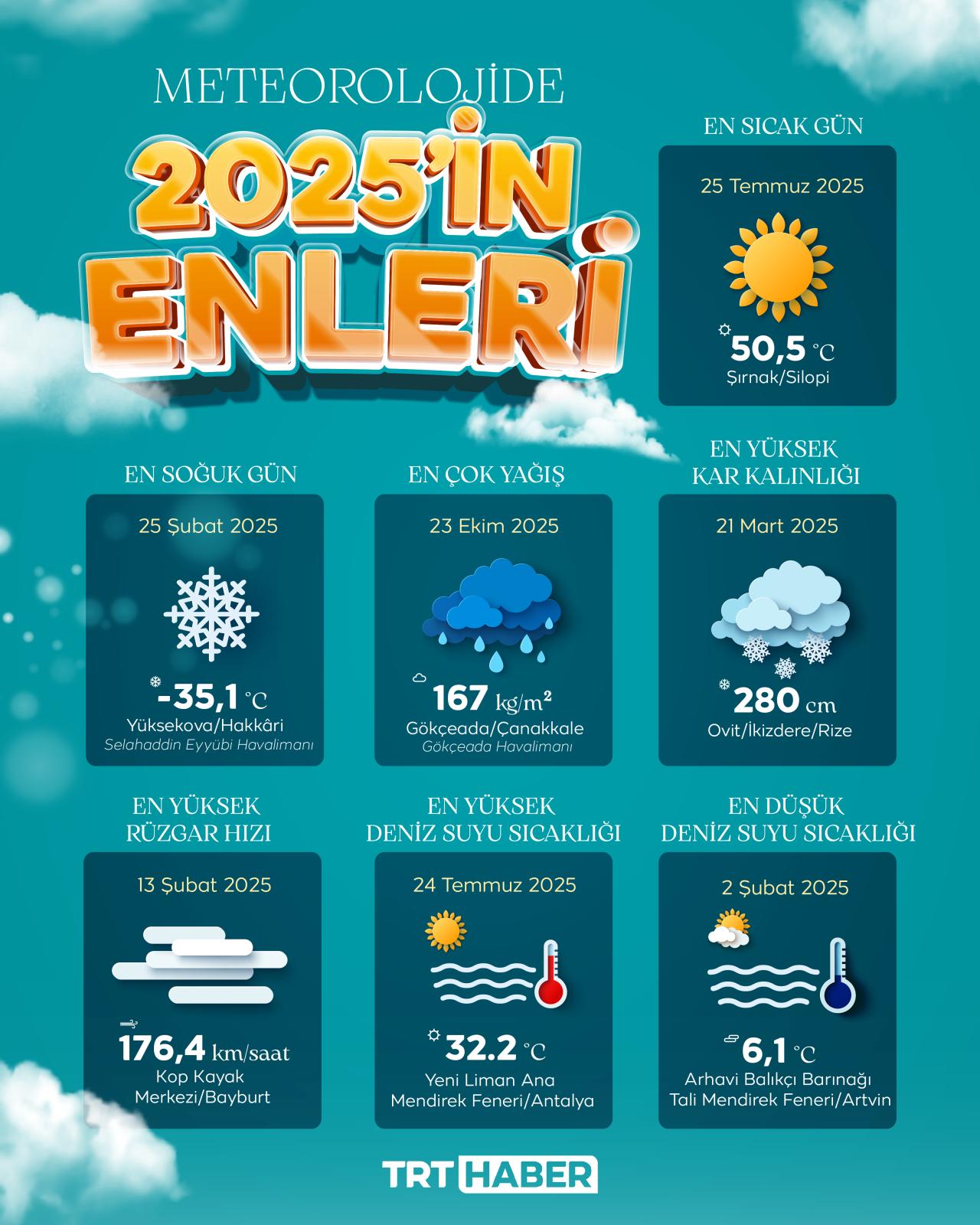 Türkiye'de 2025 yılında termometrelerin zirvesi ile dibi arasında tam 85,6 derecelik bir fark oluştu. Temmuz ayında Şırnak Silopi 50,5 dereceyle kavrulurken, şubat ayında Hakkâri Yüksekova -35,1 dereceyle adeta buz kesti.