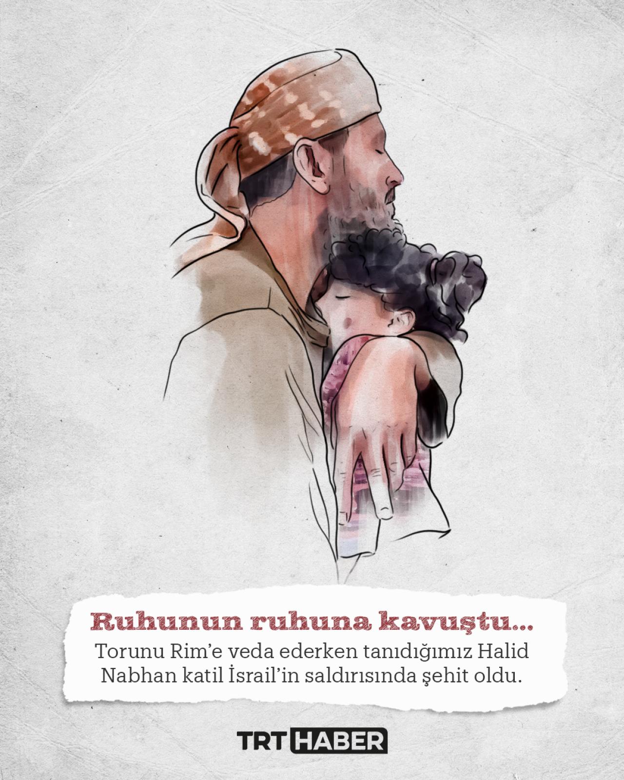 Katil İsrail'in Gazze Şeridi'ne düzenlediği saldırılarda şehit edilen 3 yaşındaki Rim ile "gözlerinin içini öperek" vedalaşan dedesi Khalid Nabhan, bugün İsrail saldırısında şehit oldu.
