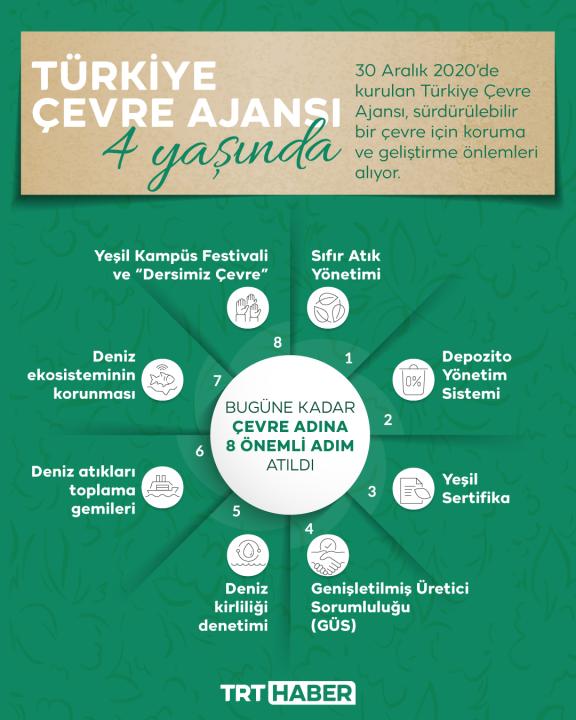 2020’de kurulan Türkiye Çevre Ajansı (TÜÇA), sürdürülebilir bir gelecek için çevreyi koruma önlemleri alarak 4 yılda 8 önemli adım attı: Sıfır Atık Yönetimi, Depozito Yönetim Sistemi, Yeşil Sertifika, Genişletilmiş Üretici sorumluluğu, Deniz Kirliliği Denetimi, Atık Toplama Gemileri ve okullara dönük çalışmalar.