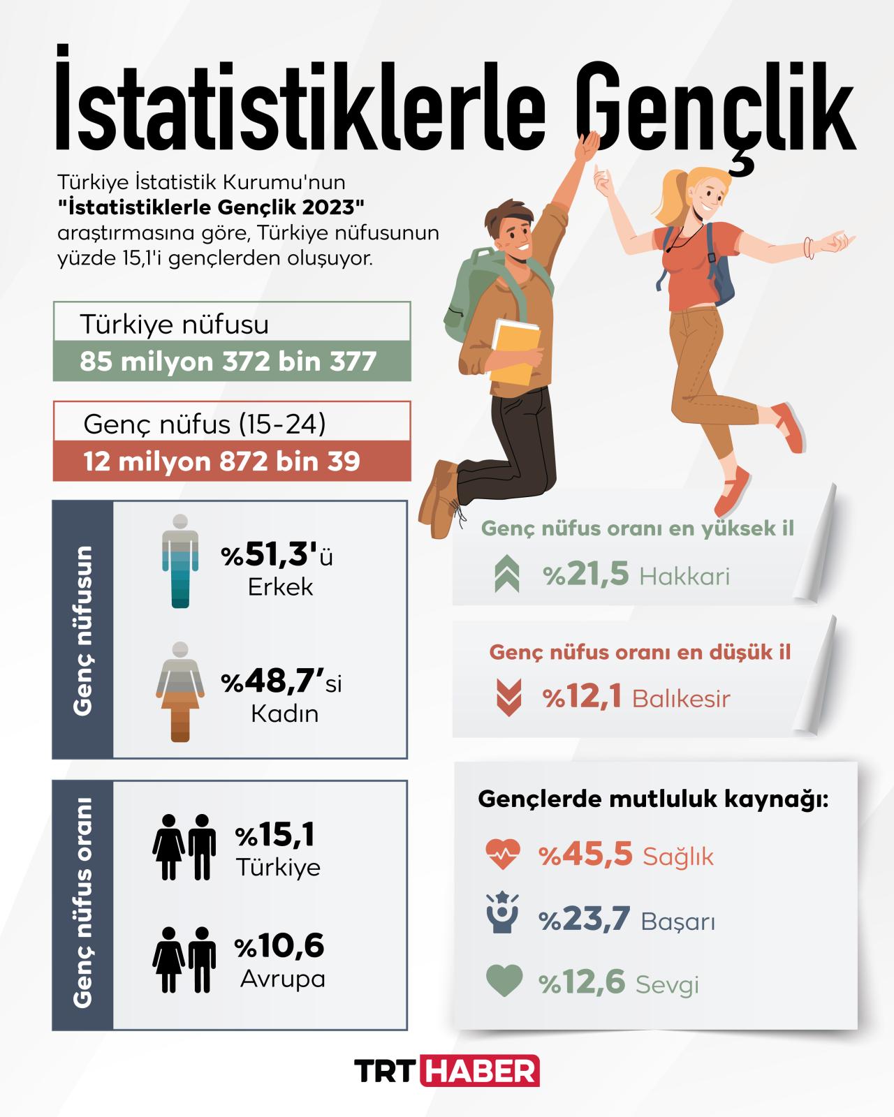 Türkiye'de geçen yıl itibarıyla 12 milyon 872 bin 39 genç bulunuyor. Genç nüfus, toplam nüfusun yüzde 15,1'ine karşılık geliyor.