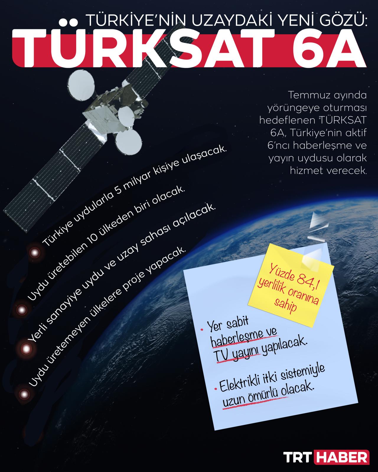 1968 yılında başlayan Türkiye’nin uydu macerasında en önemli adım olacak TÜRKSAT 6A için gün sayılıyor. Temmuz ayında fırlatılması hedeflenen uydu, Türkiye’nin 6’ncı aktif haberleşme ve yayın uydusu olacak. Yerli üretim TÜRKSAT 6A ile Hindistan, Tayland, Malezya ve Endonezya da kapsama girecek.