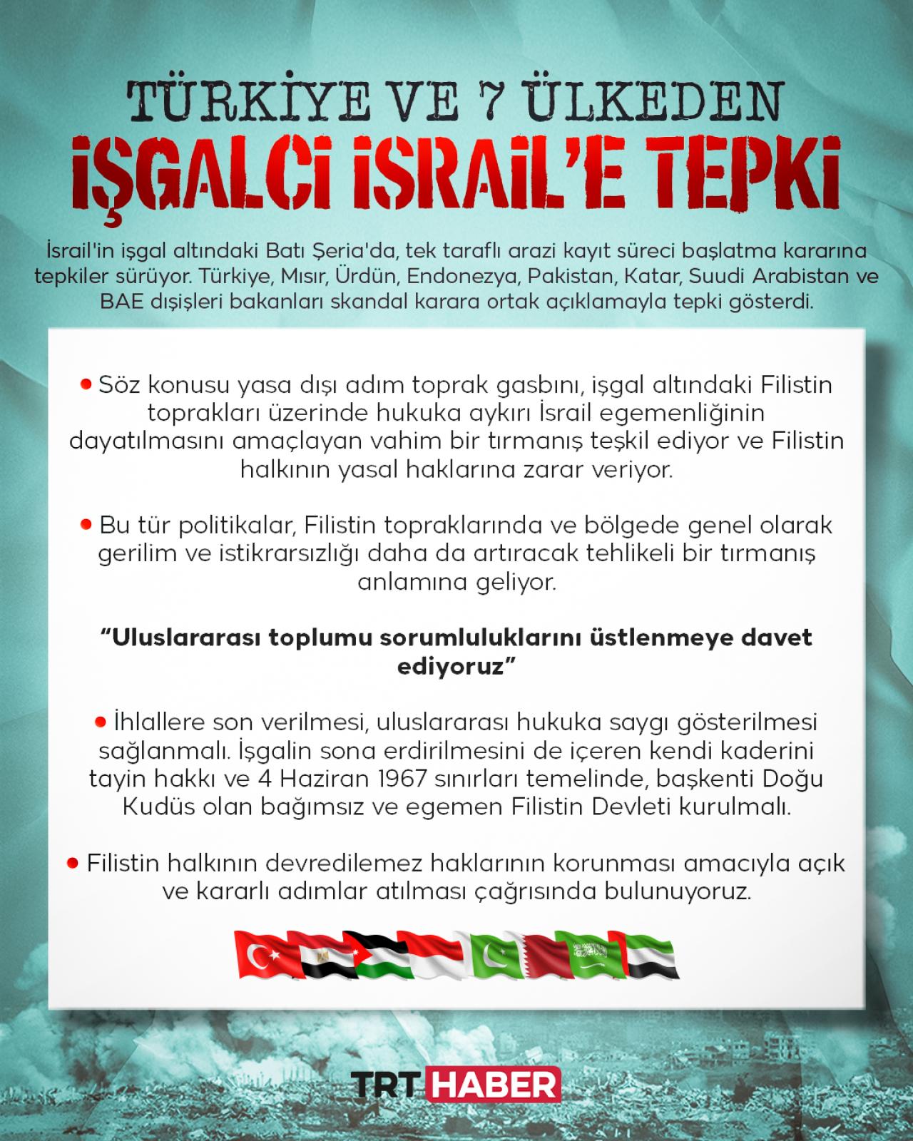 Türkiye ve 7 ülke, işgalci İsrail'in Batı Şeria'daki skandal planına tepki göstererek uluslararası topluma "sorumluluk üstlenin" çağrısı yaptı.