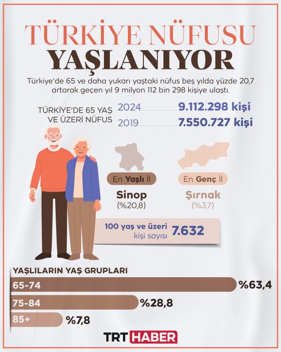 Türkiye'de 65 ve daha yukarı yaştaki nüfus beş yılda yüzde 20,7 artarak geçen yıl 9 milyon 112 bin 298 kişiye ulaştı. Yaşlı nüfusun, nüfus içindeki oranı 2024 itibarıyla yüzde 10,6'ya çıktı.