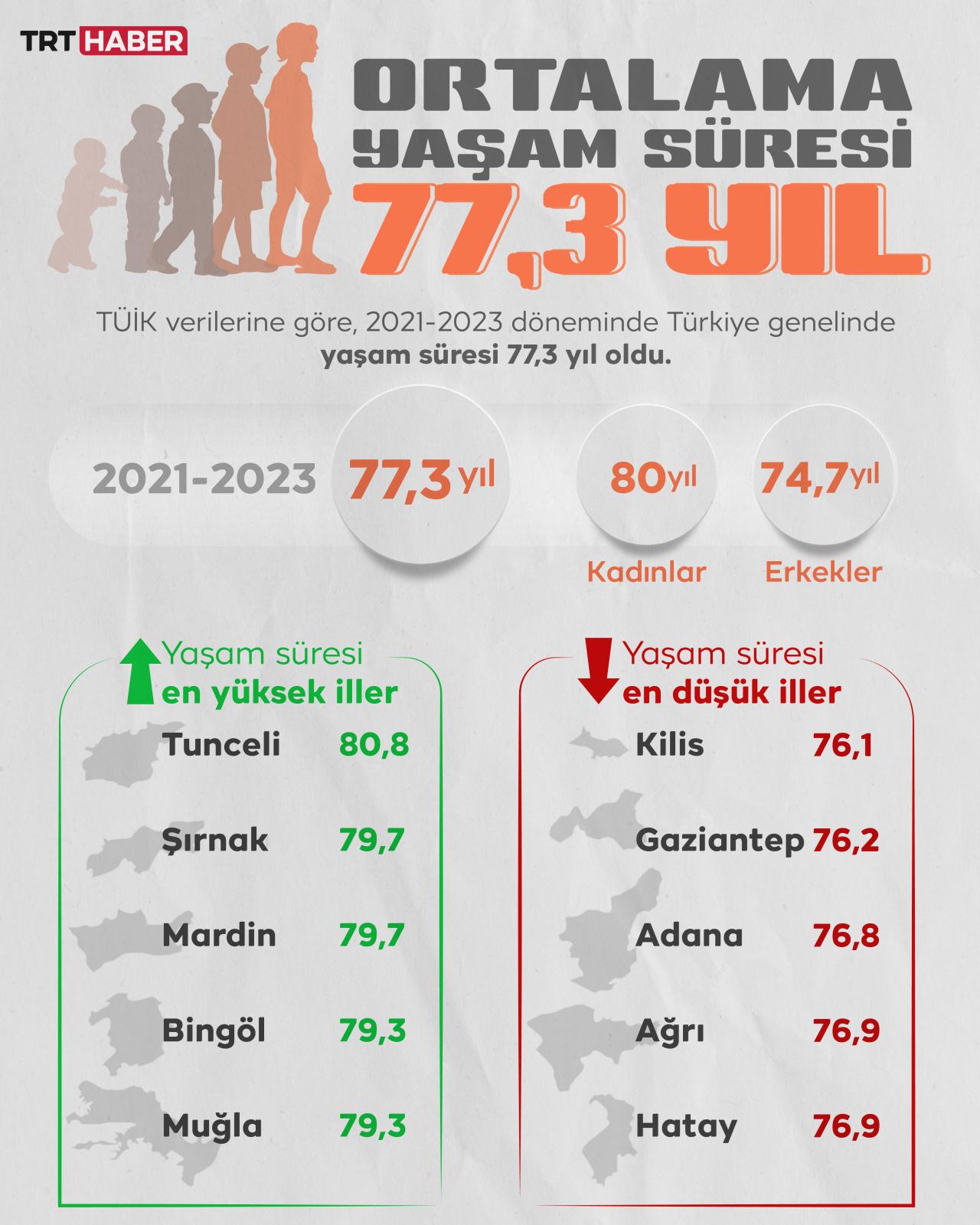 Türkiye İstatistik Kurumu (TÜİK), 2021-2023 döneminde Türkiye genelinde doğuşta beklenen yaşam süresinin 77,3 yıl olduğunu açıkladı.