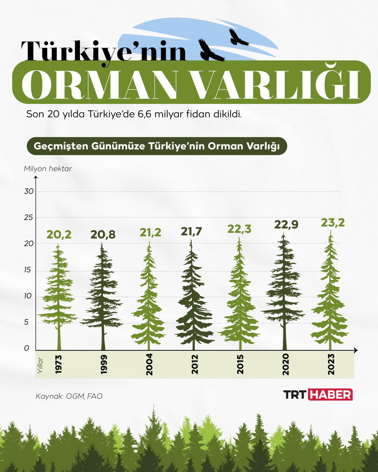 Türkiye’de son 20 yılda 6,6 milyar fidan toprakla buluştu. Öyle ki en çok ağaçlandırma yapan ülkeler arasında Türkiye Avrupa’da 1’inci dünyada ise 4’üncü sıraya yerleşti. İşte ülkemizin akciğerleri, orman varlığı…