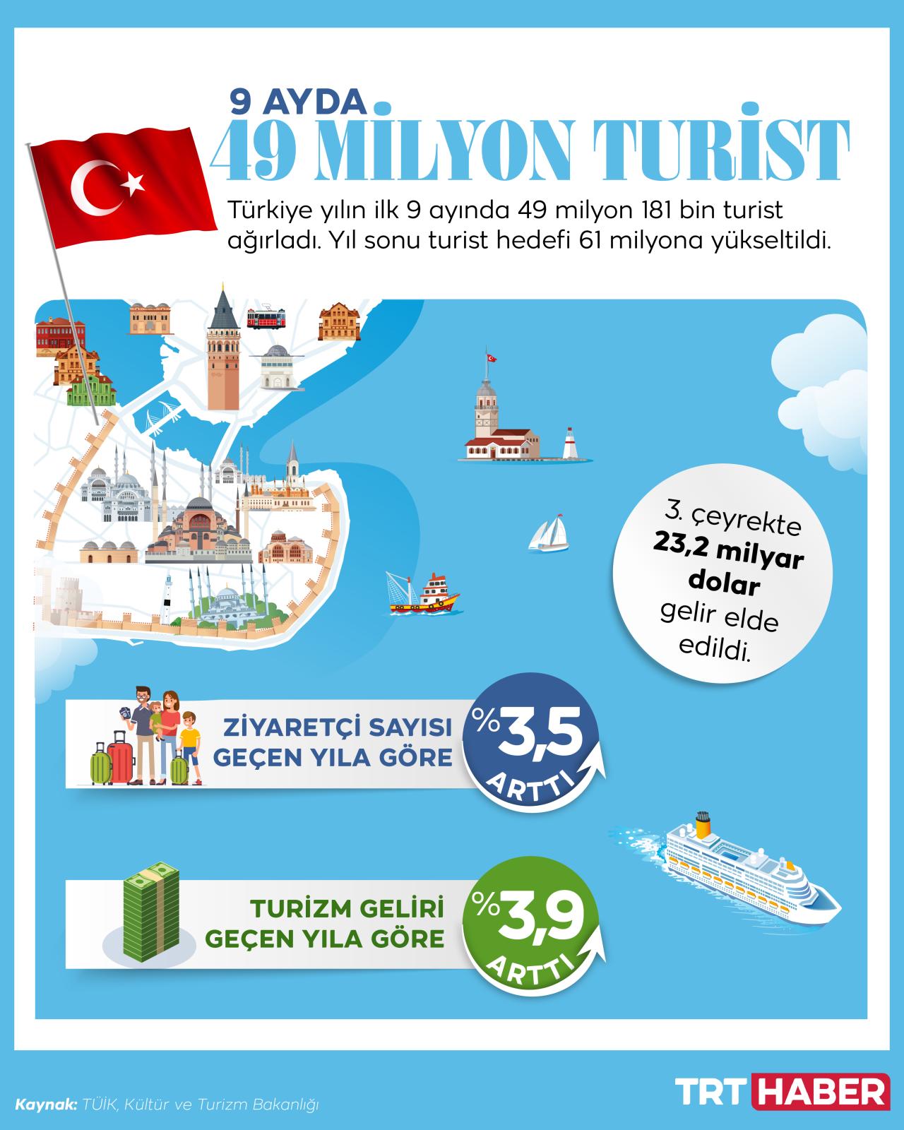 Türkiye'nin turizm geliri, yılın üçüncü çeyreğinde geçen yılın aynı dönemine göre yüzde 3,9 artarak 23 milyar 219 milyon 751 bin dolar oldu.