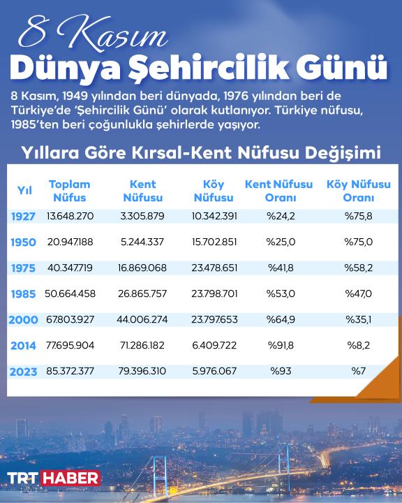 8 Kasım, 1949 yılından beri dünyada, 1976 yılından beri de Türkiye’de ‘Şehircilik Günü’ olarak kutlanıyor. Çevre, Şehircilik ve İklim Değişikliği Bakanlığı, doğal afetlere dayanıklı yapılar ve şehrin kimliğini koruyan ‘Kent Meydanı’ projeleri ile günü kutluyor.