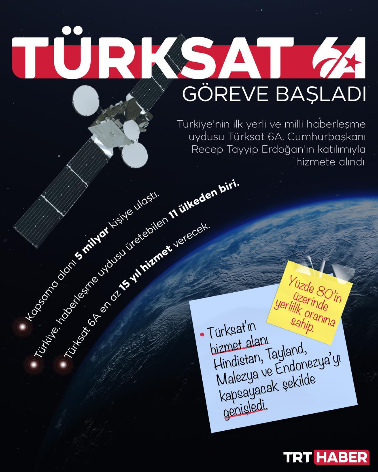 Türkiye'nin ilk yerli ve milli haberleşme uydusu TÜRKSAT 6A, hizmete alındı. Yüzde 80 yerlilik oranıyla geliştirilen uydu, en az 15 yıl süre hizmet verebilecek.