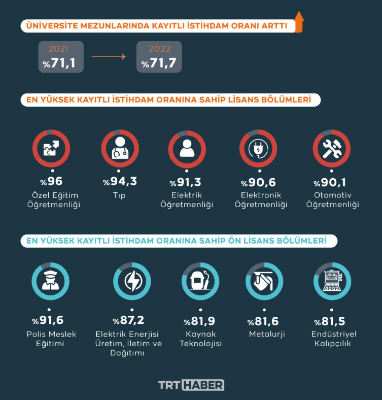 Türkiye'de lisans mezunlarında istihdam oranı 2022'de yüzde 71,7 olarak gerçekleşirken, ilk iş bulma süresi 13,9 ay olarak hesaplandı.